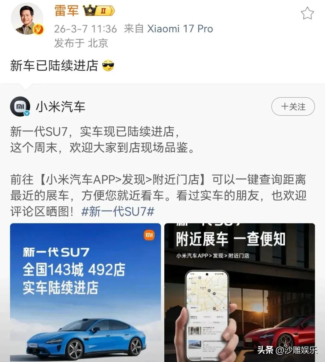 雷军,高调官宣! 3月7日,雷军在社交平台高调扔出七个字:“新车已陆续进店😎”。虽然只是一个简单的官宣,但那个“😎”表情暴露了他的小心思——又焦急又激动!原来新一代小米SU7实车已经悄然杀到,覆盖全国143城492家门店。 这哪是通知啊,分明是周末“约会”邀请函! 我仔细扒了扒这次进店的新车,发现雷军的激动是有底气的。新一代SU7全系标配了激光雷达,这意味着哪怕你买最低配,智能驾驶的硬件也给你拉满了。更狠的是Pro版续航直接干到902km,Max版充电15分钟就能补能670km。有网友调侃:“这哪是电动车,这是电动爹变电动千里马啊!” 还有个小细节,销售透露新车全系标配了三重冗余门把手,没电也能机械解锁。经历过之前的争议,这次小米在安全上确实加了“保险”。 但也有眼尖的老哥吐槽:“外观改动也太保守了吧?前脸格栅稍微改了点,不仔细看还以为就是换了车漆。” 确实,这次换代更像是一次“中期大补”,把之前欠的配置一次性还上。不过话说回来,对于没买过的人来说,这些升级全是干货;对于老车主来说,可能心里有点五味杂陈。 评论区已经有人酸了:“手里的旧款突然不香了。” 说白了,雷军这波操作就是趁热打铁。趁着热度还在,赶紧把实车铺到门店,让大家亲手摸一摸、坐一坐。毕竟现在的消费者精得很,光看发布会谁信啊?把车摆进店里,让车友用脚投票,这才是雷军最高明的一招。 话说回来,这个周末你会去店里“验货”吗?