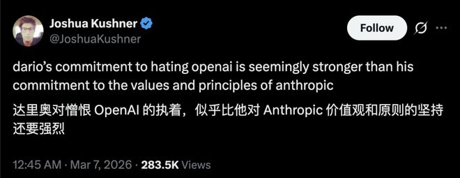 投资人JoshuaKushner都忍不住吐槽,说Amodei想恨OpenAI的劲头,简直比他坚持公司价值观的劲头还大。