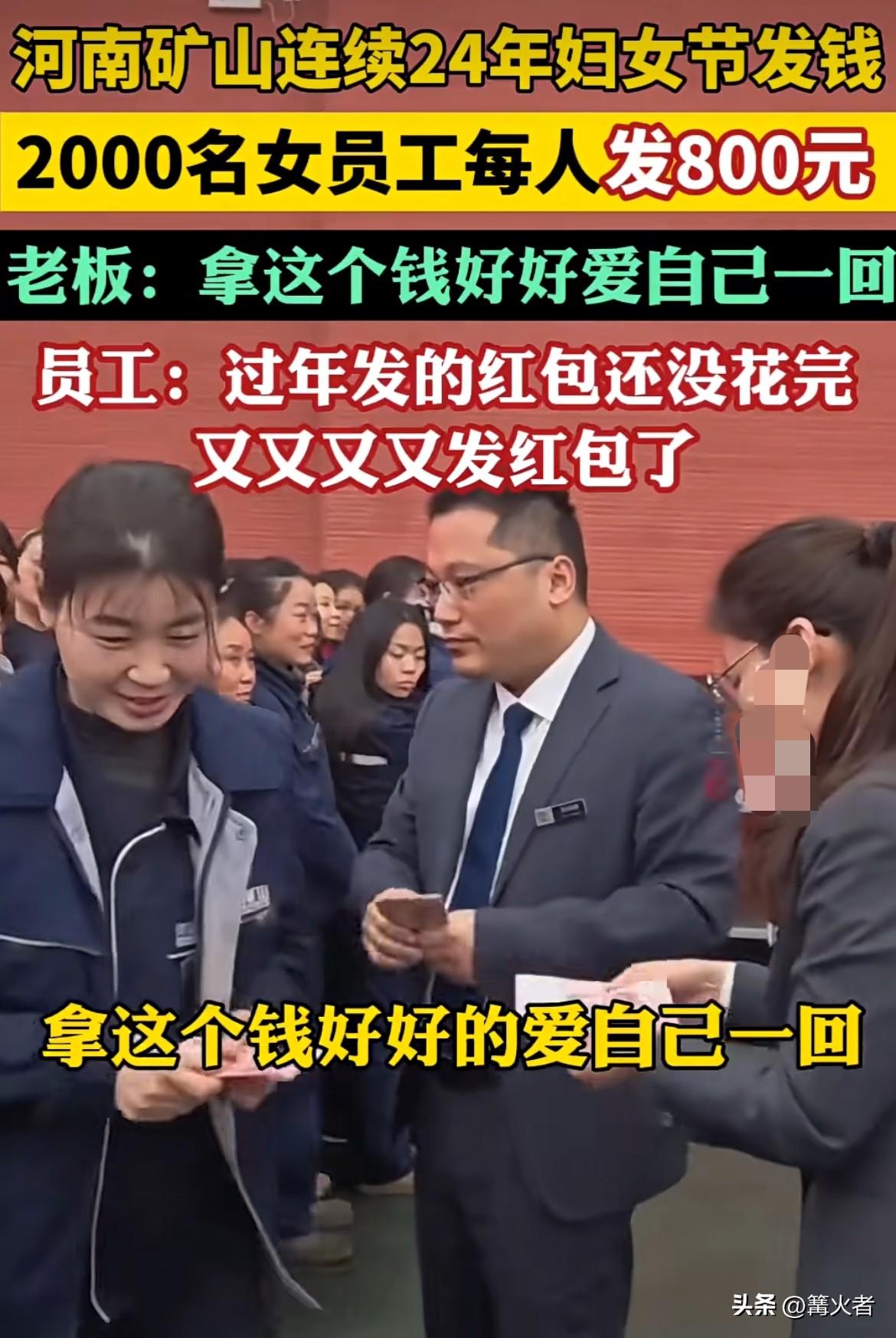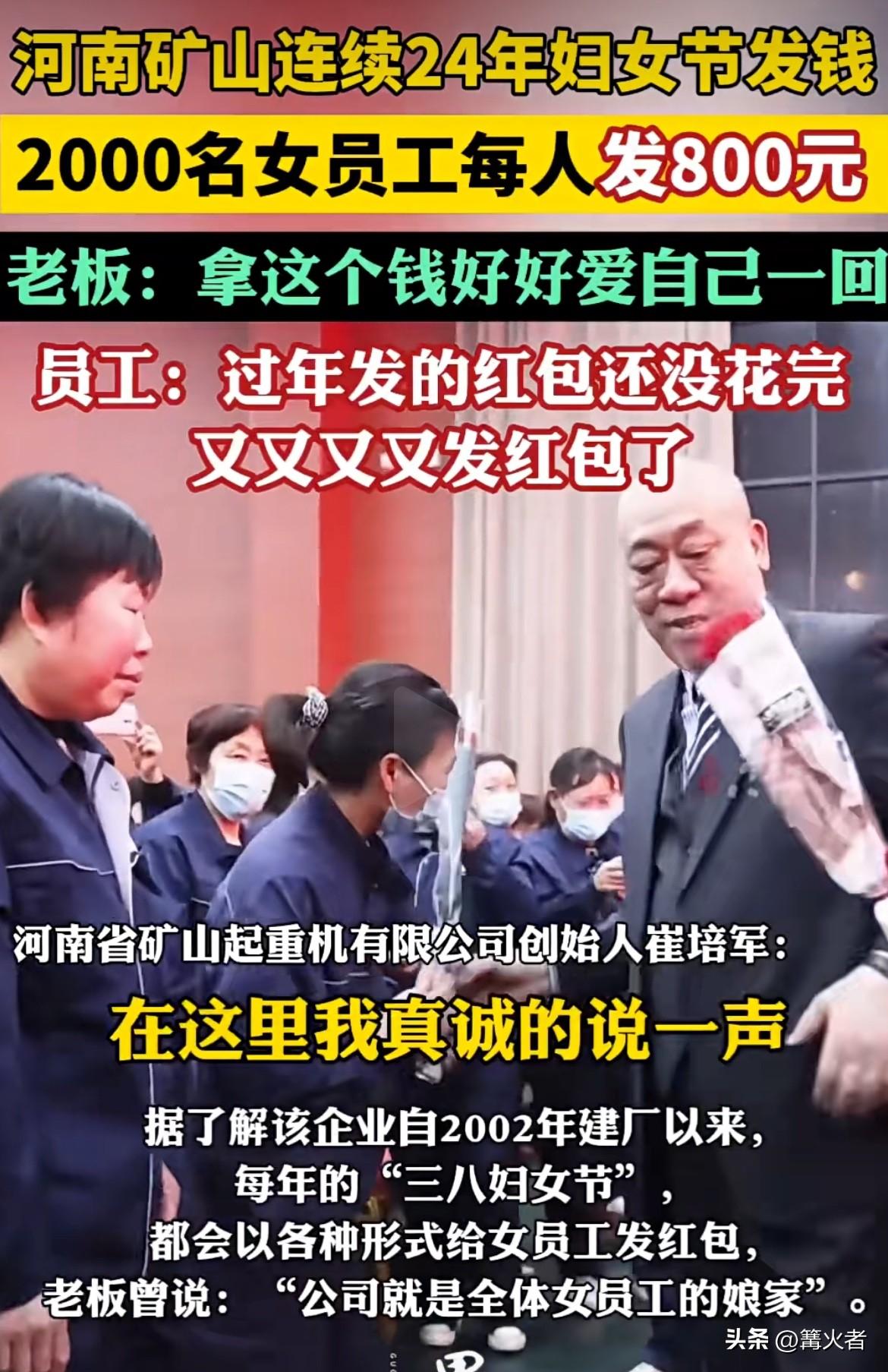 董事长崔培军给2000名女员工每人发800元现金红包,一共发了160万。老板还叮嘱女员工拿这钱好好爱自己,这样的企业谁不爱,福利一年比一年丰厚。在重工行业,女员工能在行政、财务等岗位发光发热,企业也一直记着她们的付出。