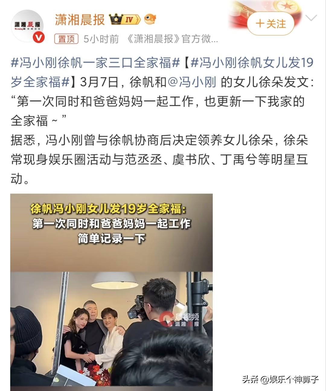 有时候,缘分这个东西很难说! 看到徐朵分享的合照,又温馨,又让人羡慕,记录与家人工作的美好瞬间,冯小刚和徐帆好开心的样子。 说实话,以前真没觉得徐朵有多漂亮,这可真的是女大十八变,身材高挑,还很有气质,主要是满满的自信,由此可见,家庭氛围特别好。 有时候,不得不相信缘分,夫妻二人领养的女儿,就像亲闺女一样对待,就连长相也越来越像了,不知道的,估计都以为就是亲生女儿,尤其一家三口的合照。 该说不说,徐朵挺幸运,遇到了徐帆夫妇,家庭条件好,还能经常与明星互动,也算赢在起跑线上。 爸爸是导演,妈妈是演员,不知道以后会不会踏入娱乐圈,挺让人期待。