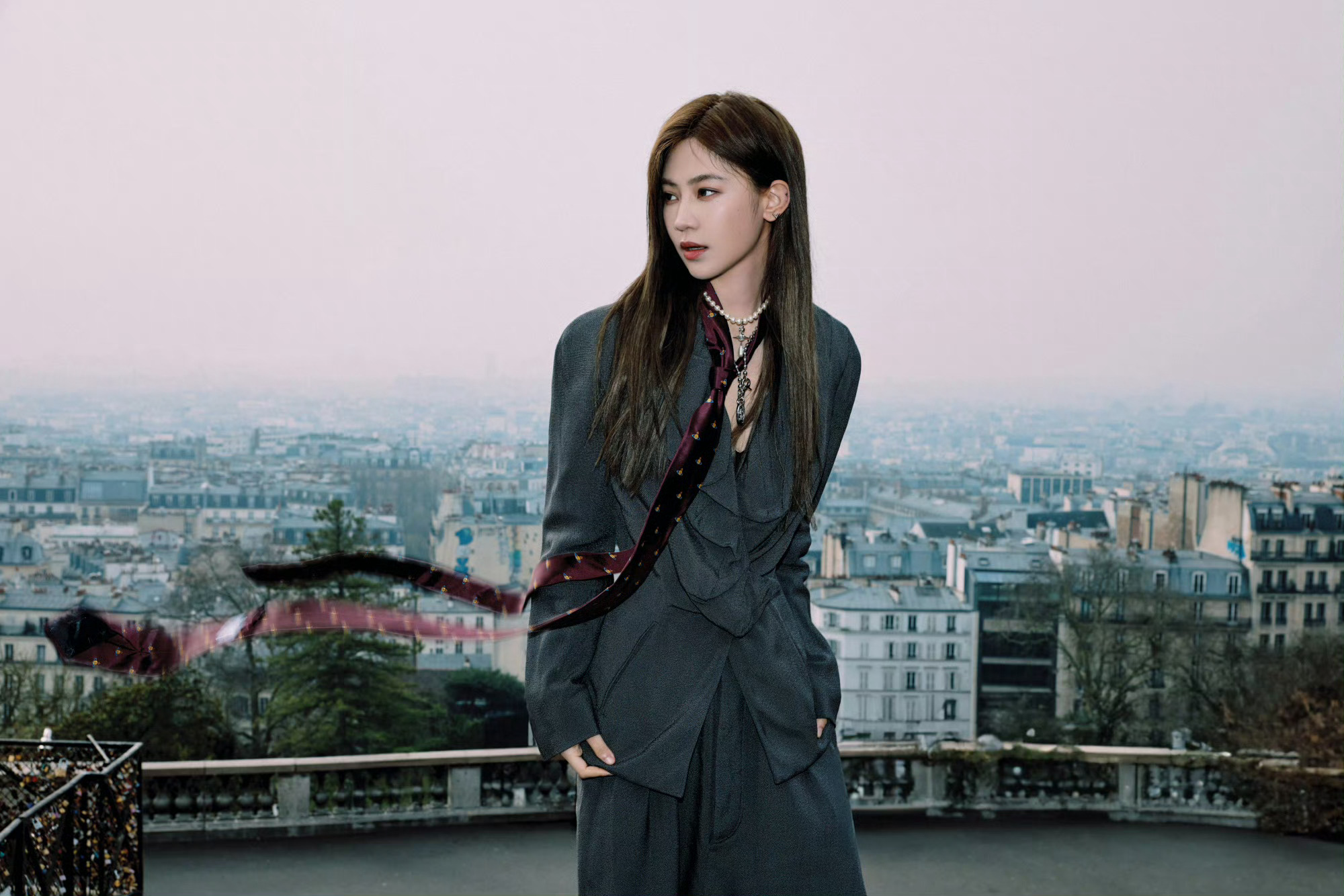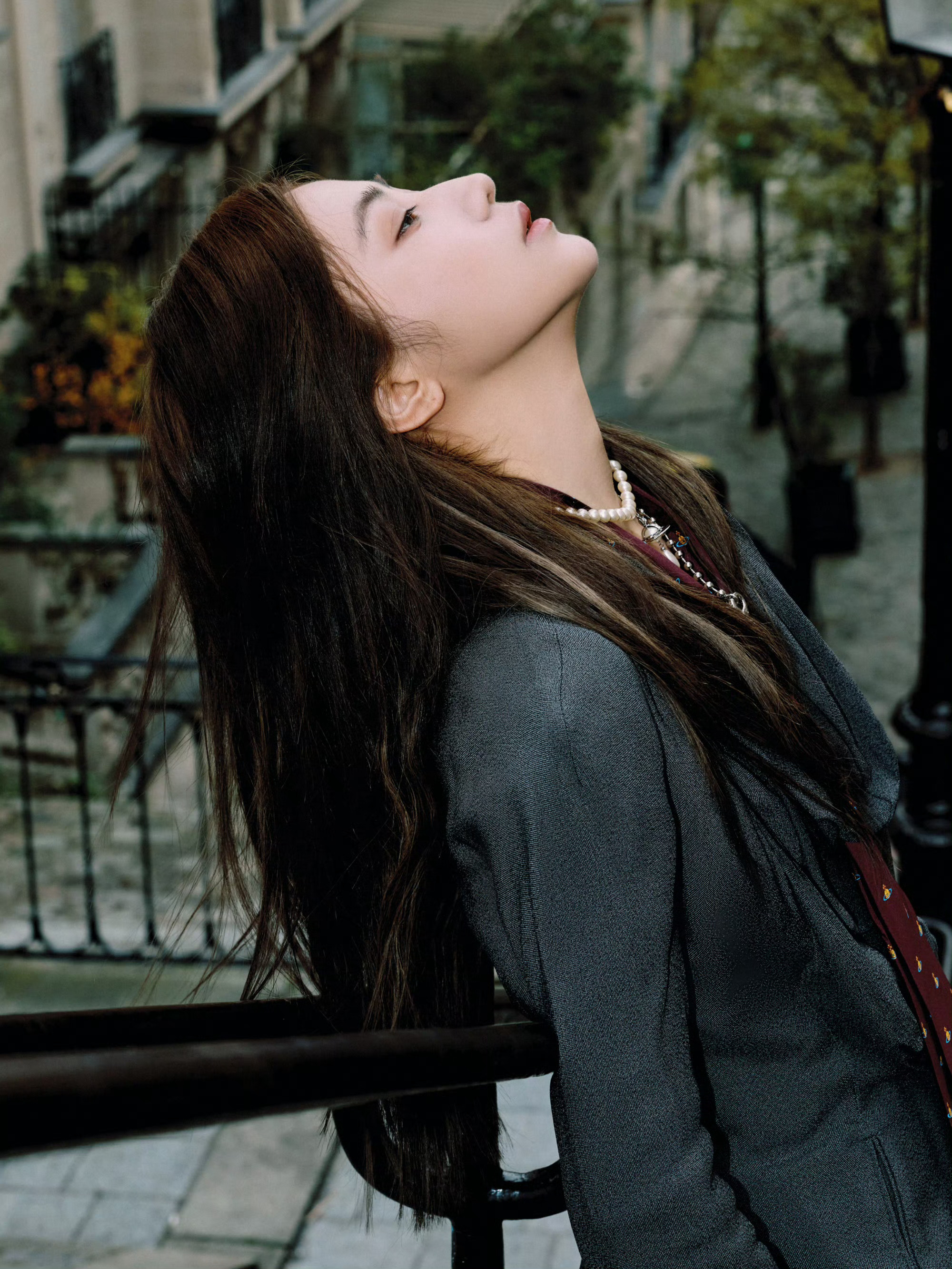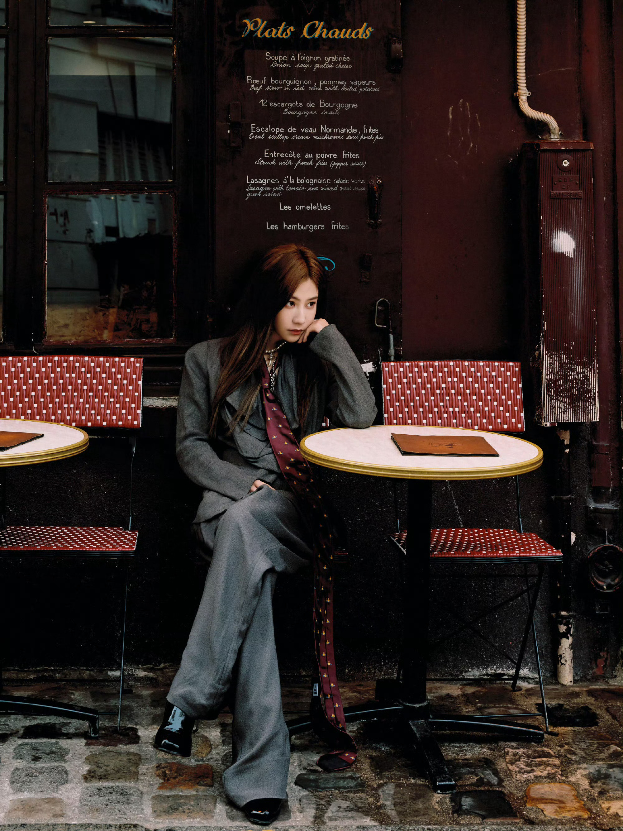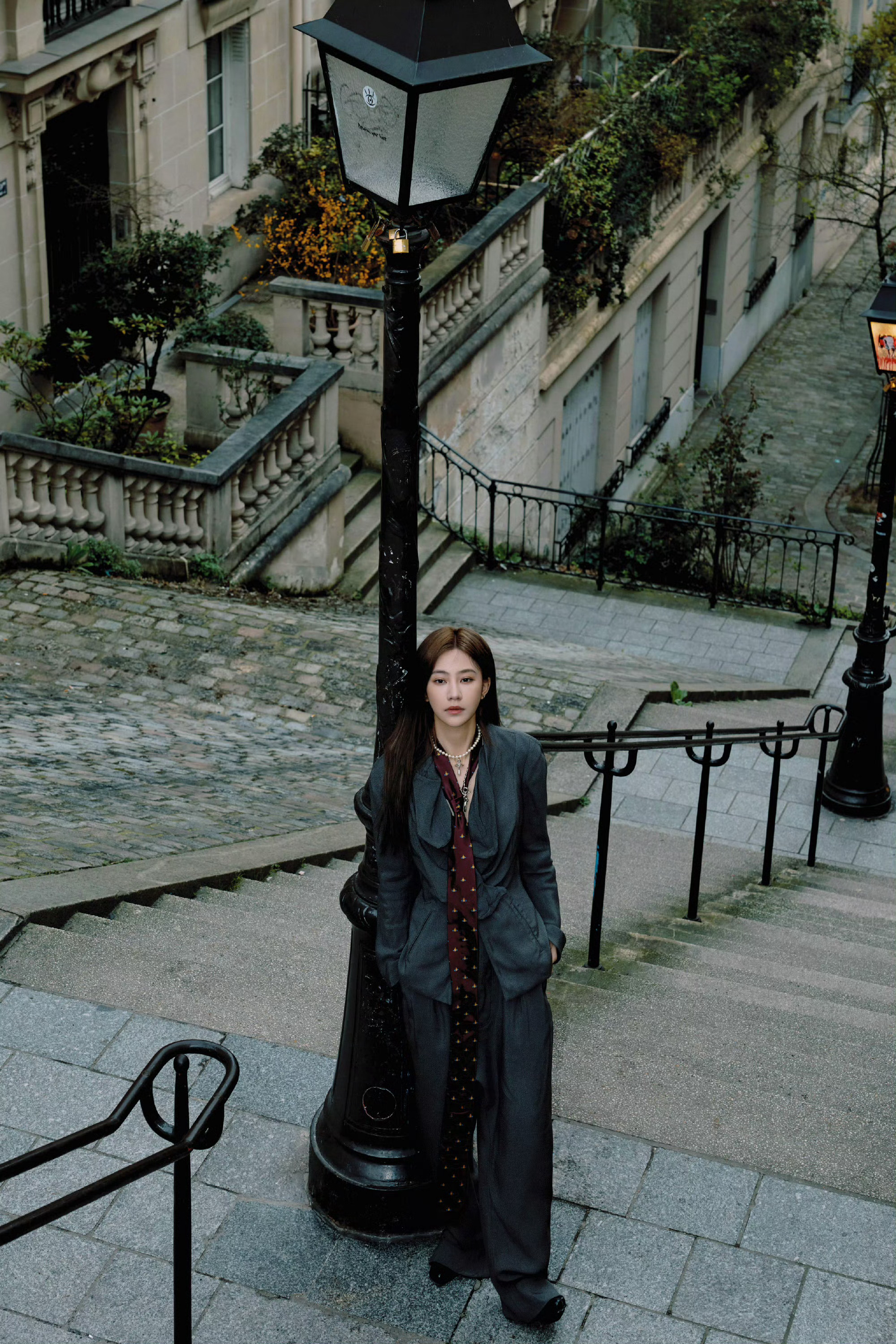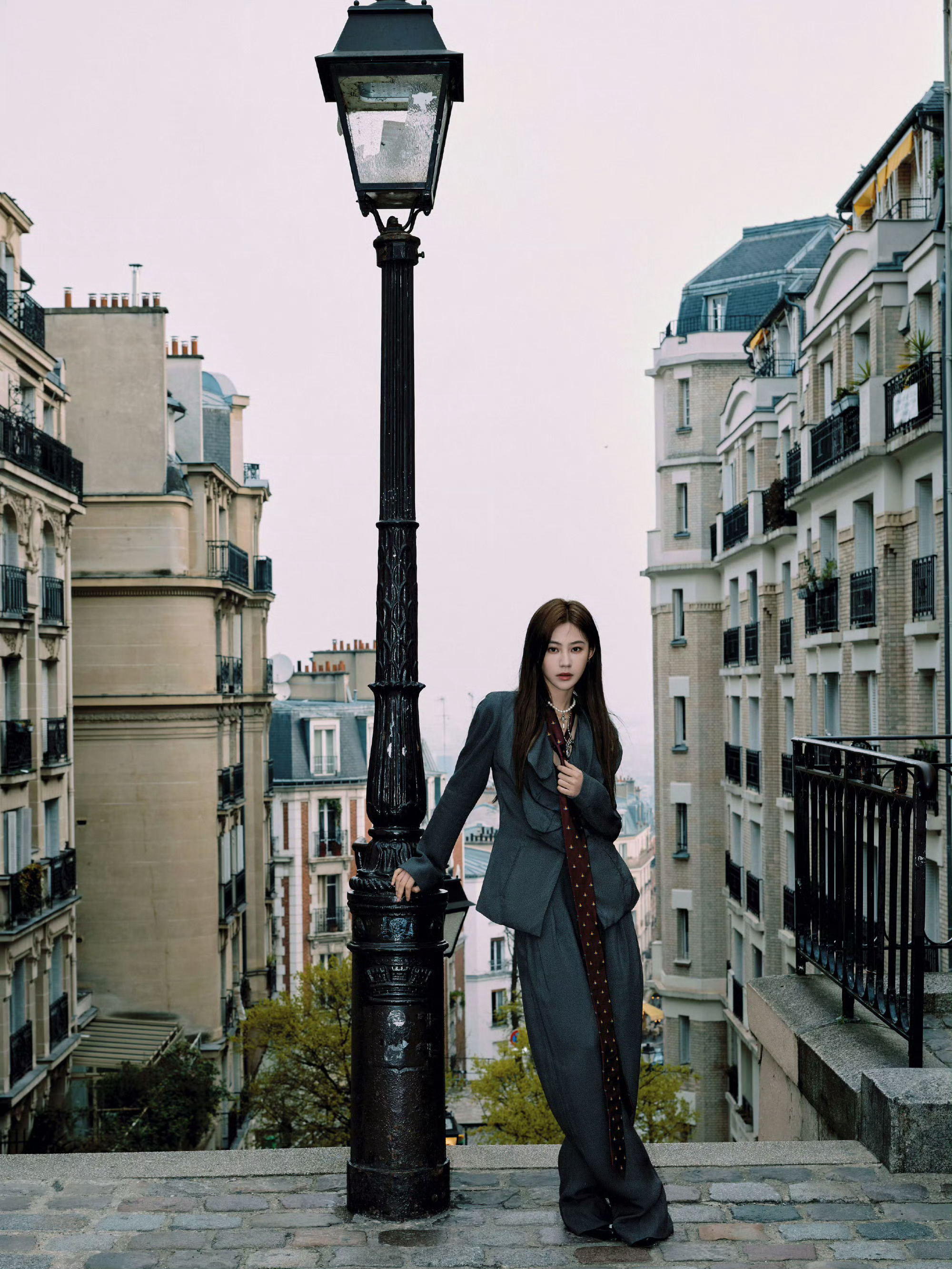 袁一琦巴黎时装周造型出图袁一琦巴黎时装周造型出图灰色v领收腰套装女王好飒脖子上的