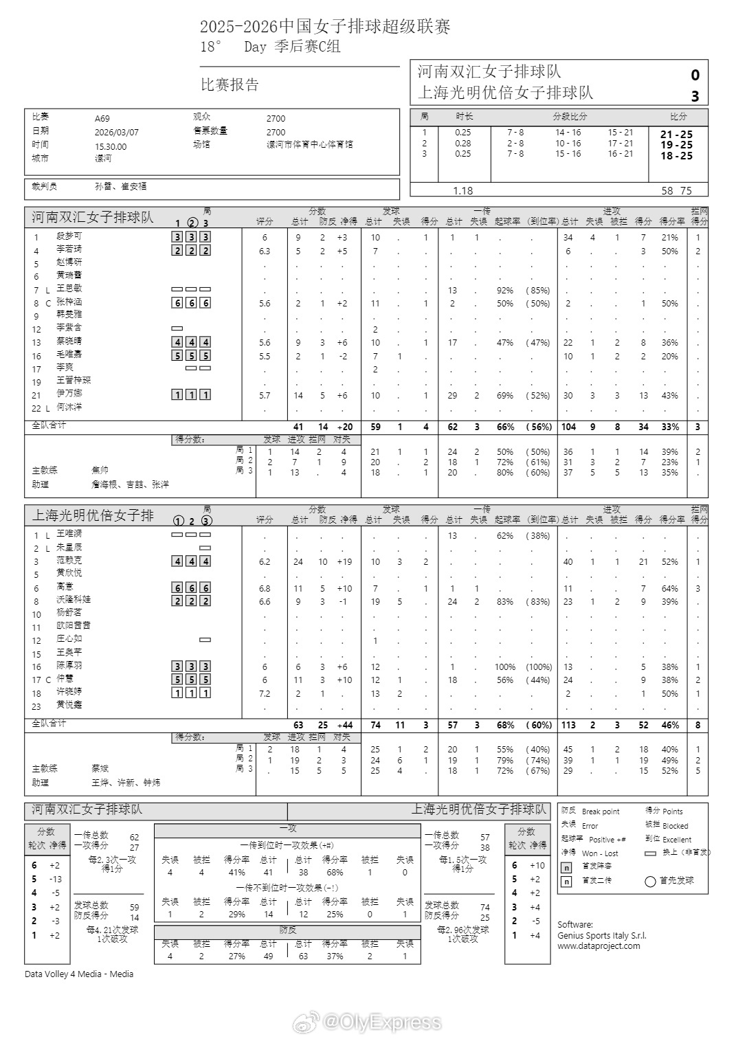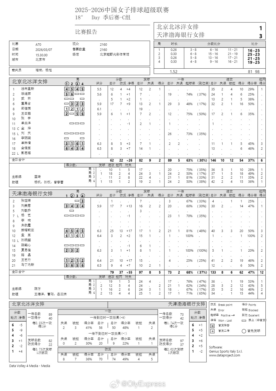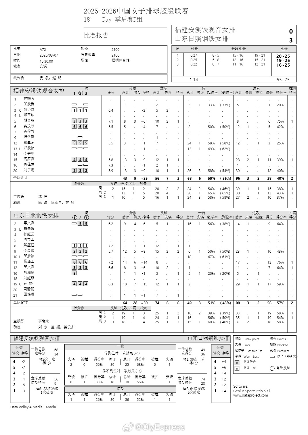 排超联赛 3月7日,女排联赛季后赛技术统计。