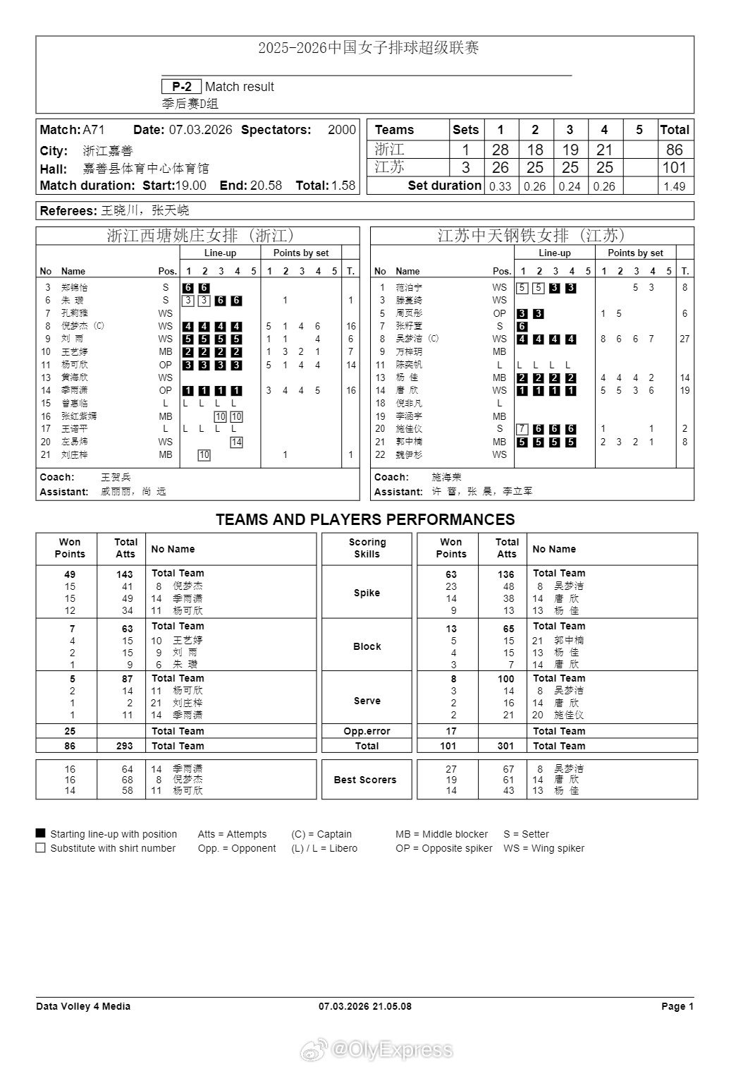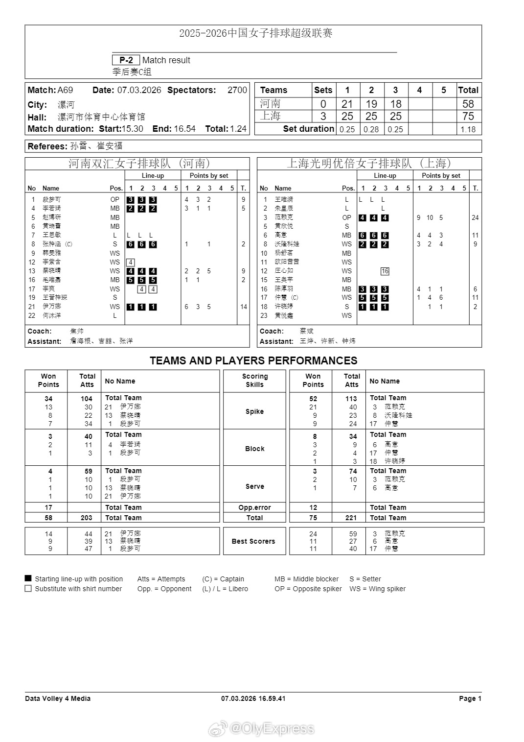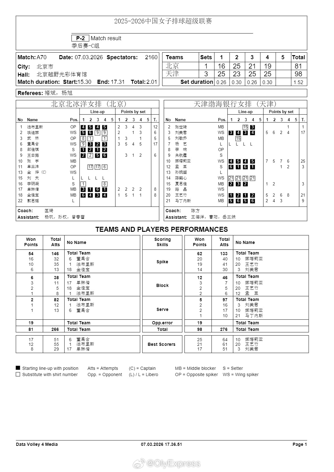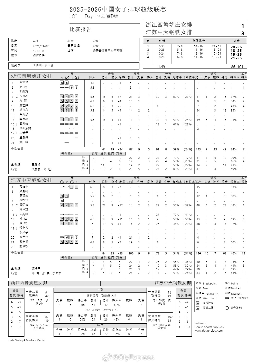 排超联赛 3月7日,女排联赛季后赛技术统计。