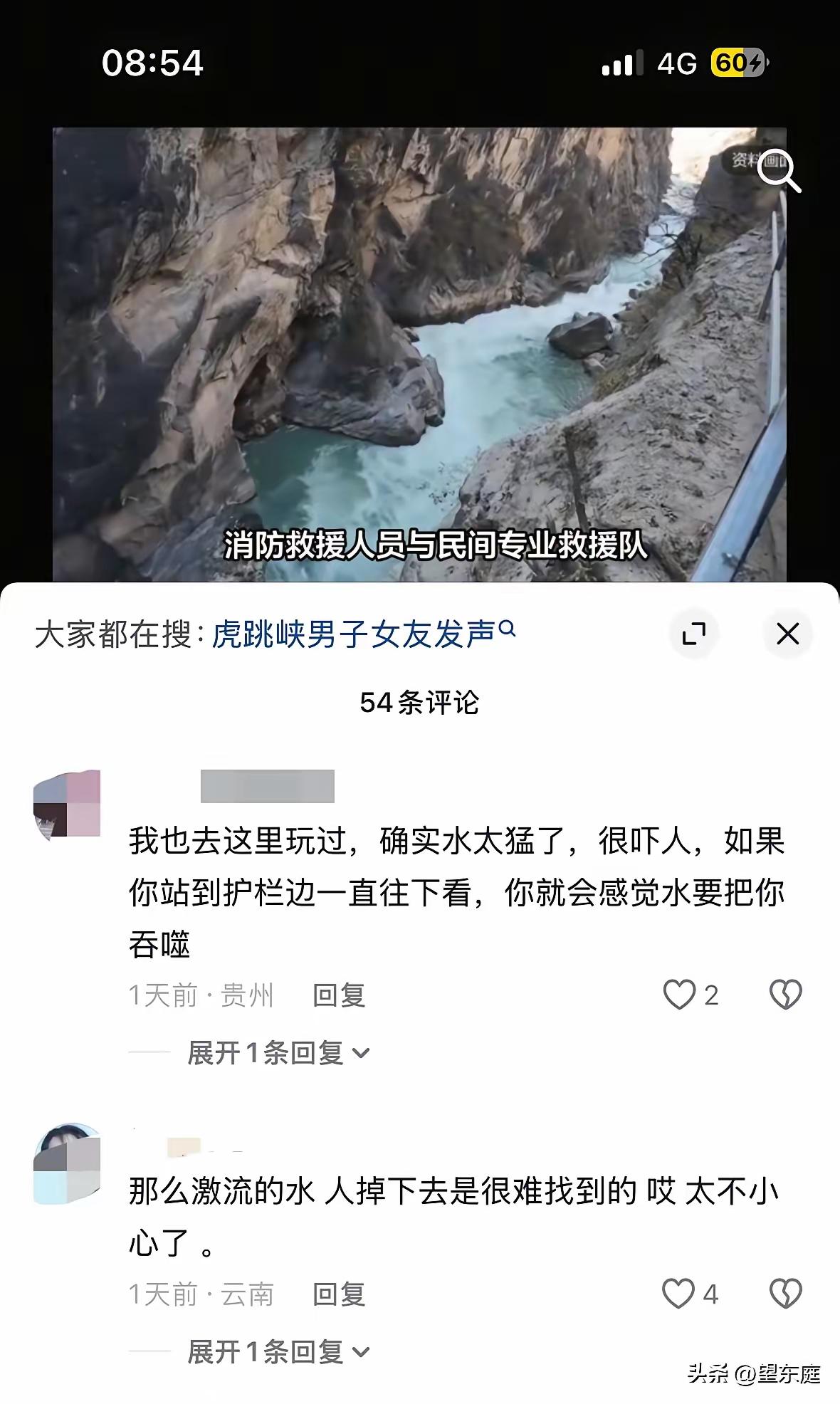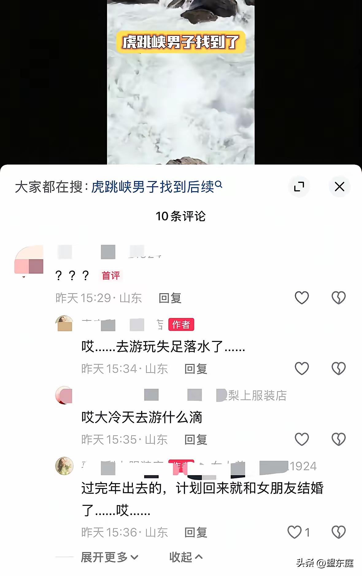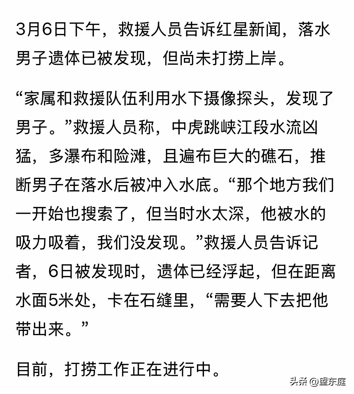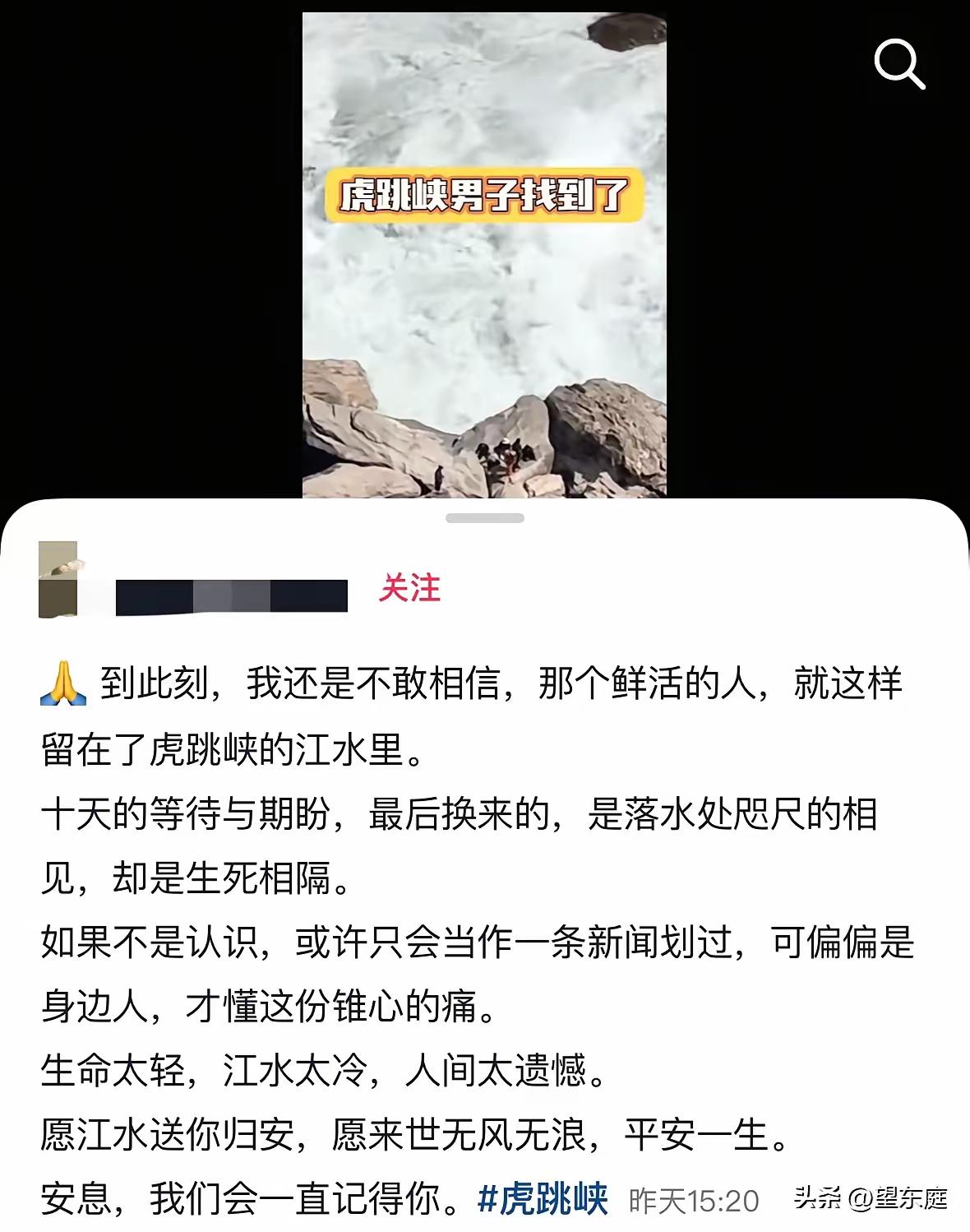 悲痛!在虎跳峡落水的29岁男子遗体被找到了!他是山东枣庄人,之所以去云南是和女友过去拍婚纱照的。拍完后,他们又多留了几天,想趁着假期好好游览一下云南的大好河山! 今年2月份,云南虎跳峡发生了一件令人心痛的悲剧,一对情侣徒步旅游时,男子不幸坠崖落水。 随着落水原因曝光,就连同行的女友也受到了不少人指责。 3月6日,打捞队终于传来消息,落水男子已经被找到,可落水地却让不少网友心疼。 这么猛的水,要洗杯子,什么思维,可惜了。远远看着都害怕,怎么还敢去洗杯子,杯子就这么重要吗? 云南的江都特别险,当年日本人为什么没夸过怒江,就是因为险,云南的三江都非常险,看似不宽但水流湍急,除了浅滩其它地方不要尝试。 为了洗杯子上的泥巴,导致落水身亡,实在太不应该了。杯子上的泥巴,可以用矿泉水瓶子里的水去洗呀,为什么一定要用虎跳峡的江水去洗呢?如果手里没有矿泉水,那个杯子马上不洗了,拿到方便洗的地方再洗,不可以吗? 虎跳峡,一听就是危险之地,山东汉子估计大都不会游泳,一旦落水,基本玩完,俗话说,水火无情,许多教训都是用生命换来的! 更令人揪心的是,两人本来打算旅游结束之后就回家办婚礼,可意外就这样毫无征兆的发生了。 之后的搜救工作中,搜救队也陆续找到了男子几样东西,有杯子,也有登山杖,还有他的黑色外套。 君子不立危墙之下!巨石经浪花拍打千万次还是巨石!人,也许,一次都不行! 可别让好好的救援队下去捞他吧,救援队员也是父母的宝贝呀! 网友表示:我们村的一个九零后让朋友给他拍照,就站在虎跳峡景观台那里双手比了个✌️就掉下去了,十年过去了到现在连尸体都还没找到。🤦🤦🤦 我老家也是有个男的25岁订婚了,夏天和朋友去河里游泳,他不会,他在河边等他两个朋友,然后他朋友游好3个人都上车了,他说脚上有泥去河边洗一下,就掉河里淹死了。 在大自然面前,个体是很渺小的,所以任何人都要敬畏大自然,特别是不熟悉的路况。否则,悲剧发生了,就只能空悲切了! 这起悲剧再次提醒我们:不要轻易挑战自然的底线,每一次“说走就走”的冒险,都可能让家人陷入无尽的等待。