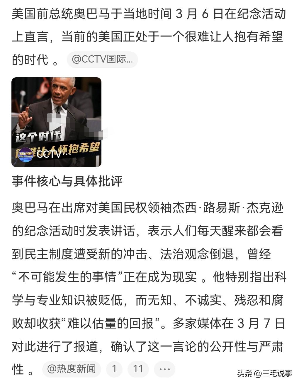 奥巴马说的还是很有道理的。当地时间3月6日。 奥巴马说当前的美国很难怀抱希望。 民主制度遭受冲击,法治观念也在倒退了,科学与专业知识被贬低。 我认为很大原因是归咎于特朗普政府的胡作非为呀。 美国最好是祈求特朗普早日下台,特朗普不下台,美国不会朝好的方向发展。