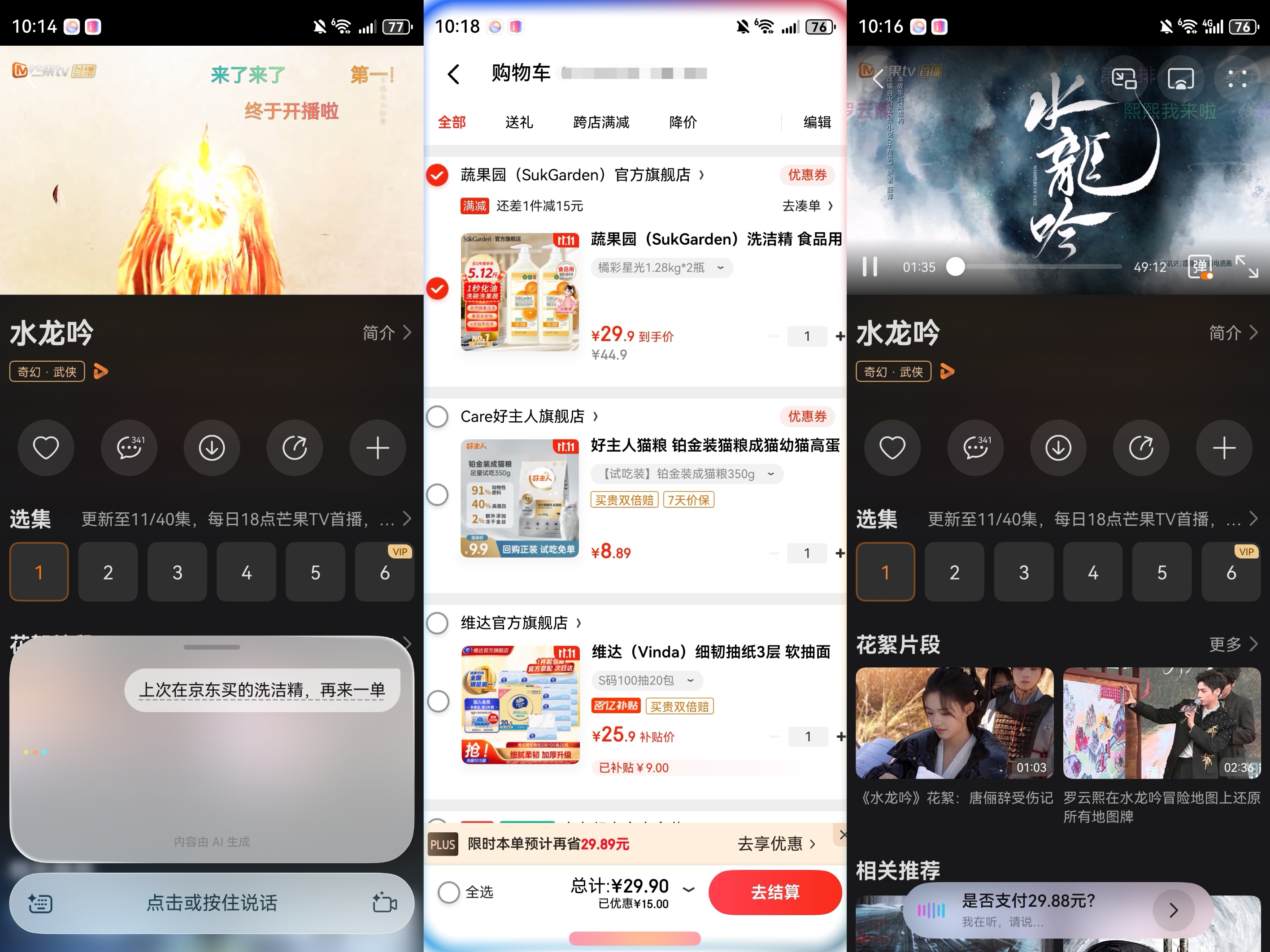 除了视觉搜索,小艺还具备强大的语言交互与任务执行能力。升级至HarmonyOS 6后,只需一句简单指令,小艺就能够完成跨应用、多步骤的复杂操作。比如说你正在看视频或者是阅读资料的时候,突然想起来家里的洗洁精快用完了,只需对着小艺说“上次在京东购买的洗洁精再来一单”,小艺就会自动执行操作下单流程,直至付款环节才会以流体弹窗的形式提醒你支付。全程无需跳出当前页面,也无需手动操作,真正做到了"动动嘴就搞定"。这种高效无缝的体验,正是"小艺帮帮忙"功能所带来的效率提升。