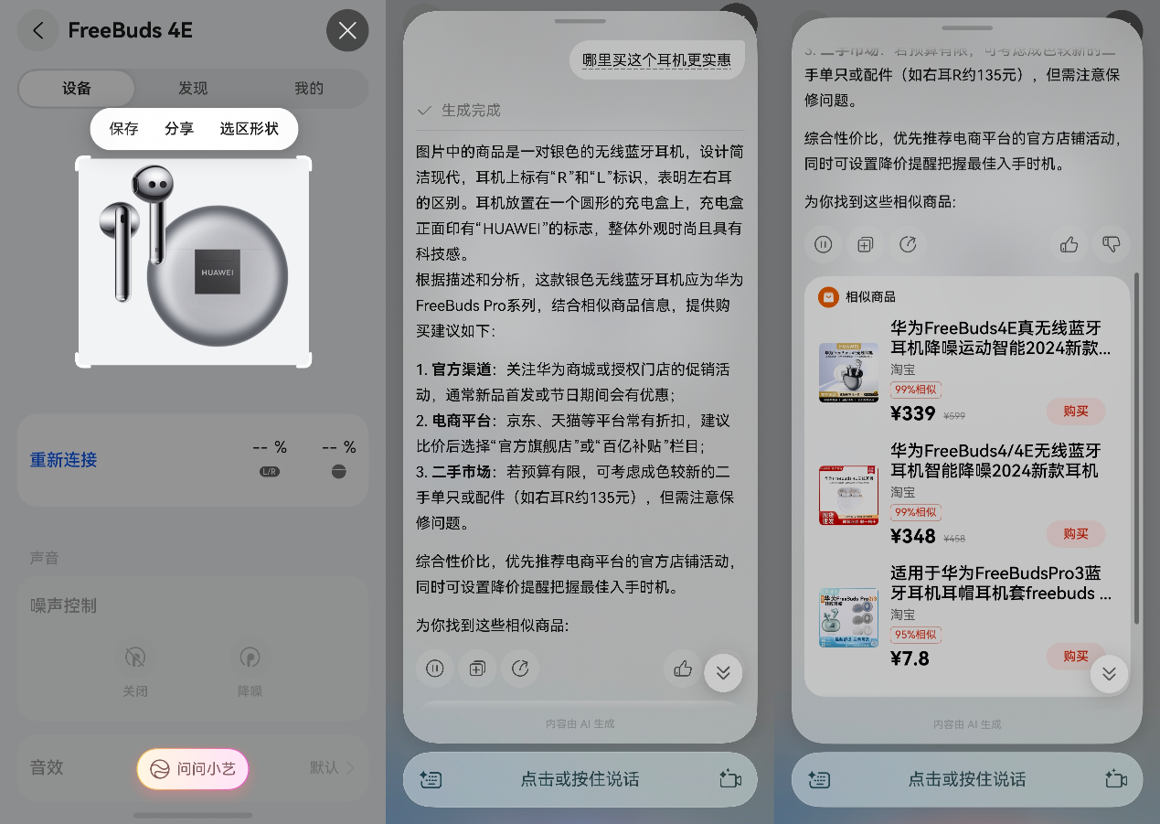 小艺的圈选识图功能,让你不再需要反复跳转于不同购物软件之间,也不必手动输入一长串商品关键词,就能够快速找到心仪的商品同款和最低价。无论是刷到喜欢的服饰、家居用品还是电子产品,只需要使用指关节圈选商品区域,点击“问问小艺”或“识图搜索”,即可一键搜到同款,获取全网的优惠信息。整个过程流畅自然,不仅省去了来回切换应用的麻烦,也避免了反复比价所耗费的时间,真正实现了“一眼找同款、一键比价”。