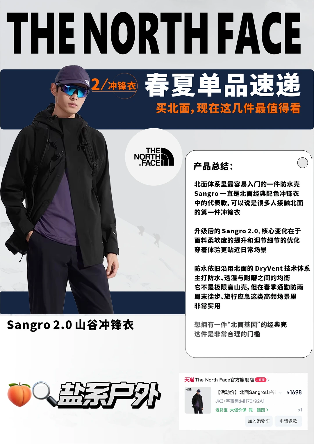 [露营灯R]升级后的 Sangro 2.0,核心变化在于面料柔软度的提升和调节细节的优化,穿着体验更贴近日常场景。防水依旧沿用北面的 DryVent 技术体系,主打防水、透湿与耐磨之间的均衡