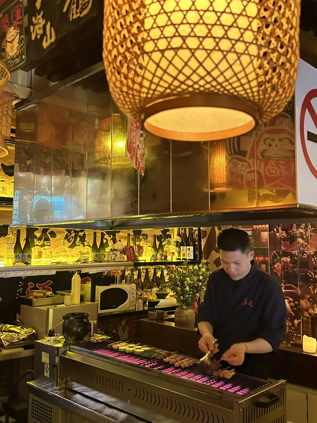 没想到在北京也有烟火气十足的居酒屋🏮了, 三层小楼,暖黄灯光+私密包间+烧烤围坐的吧台,一进门就被治愈了,完全是日剧里的场景~