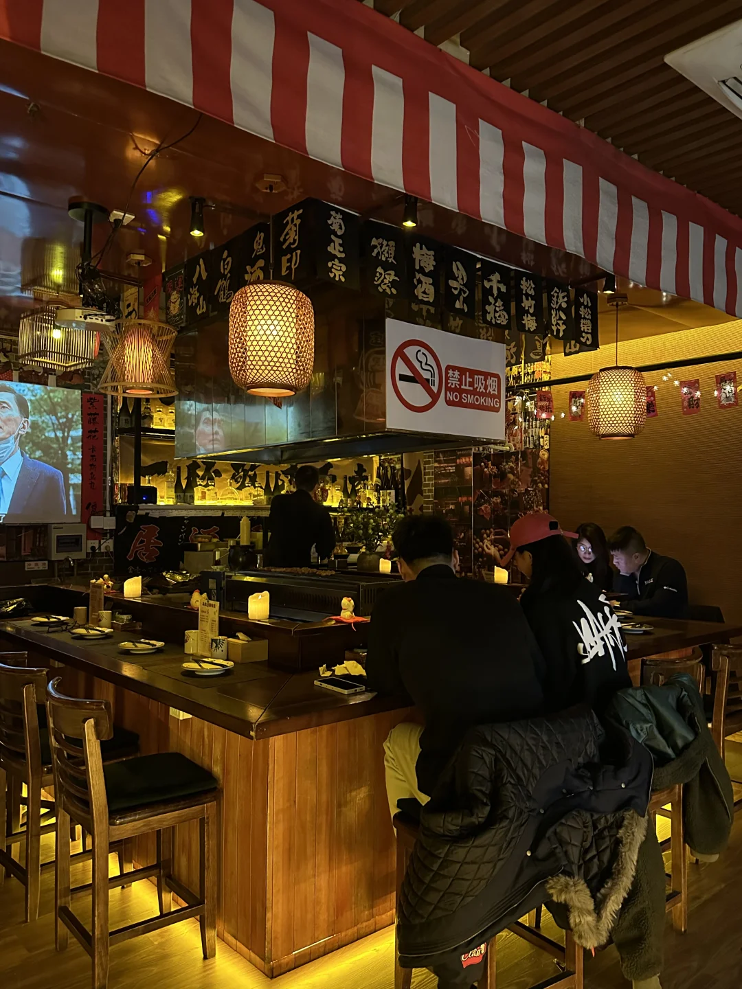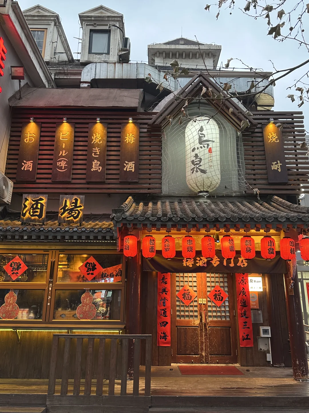 木质门头挂满红灯笼,店内暖光灯笼+日式酒牌,氛围感直接拉满📸