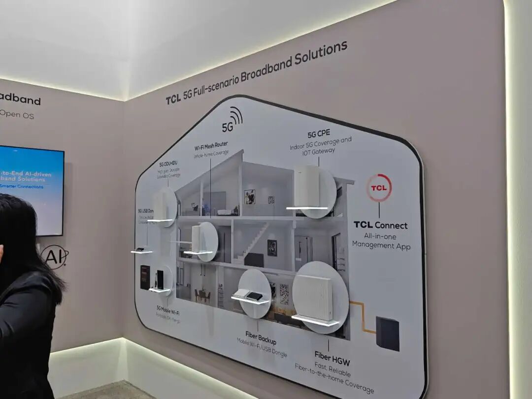 此外,TCL也展出了它们对智能家庭场景的范本。案例里展示了一栋两层小屋被拆开,里面对应摆着Wi-FiMesh路由、5GCPE、光纤入户网关以及应急的备份连接方案,旁边再用一条清晰的连线把它们串成「从光纤到5G,再从客厅到卧室」。