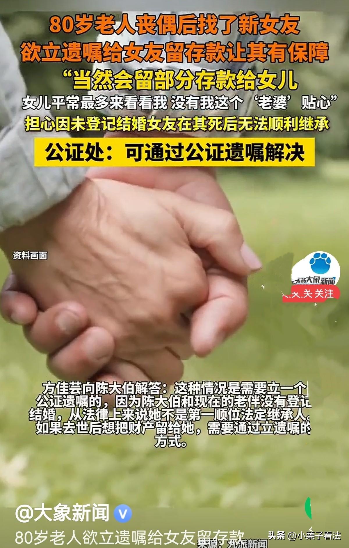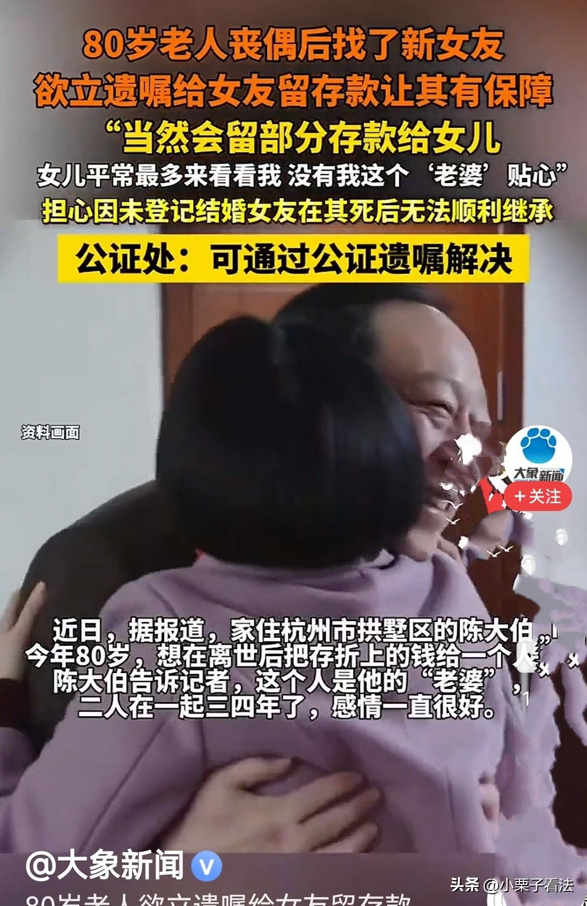 浙江杭州,80岁大伯有一个相处三四年的女友,两人并未领结婚证,他担心自己去世后,女儿不会分给她遗产,便想趁身体还好,立下遗嘱,让女友顺利得到其遗产,给她保障。公证处回应:可通过公证遗嘱解决此事!网友:男人到80岁还是有颗少年心! 80岁陈大伯早年丧妻,有一个女儿已成家,女儿时常回来看望照顾她,可因还要顾着小家,不能总陪伴在他左右。 女儿怕对陈大伯照顾不够周全,便雇了个住家保姆照顾父亲,可陈大伯仍觉得孤单,觉得保姆照顾的不够贴心细致。 三四年前,他遇见一位温柔细心的阿姨,两人相聊甚欢,很快发展成了恋人关系,搭伙过起了日子:三餐有人做、病痛有人守、深夜有人陪。 没有盛大婚礼,没有一纸婚书,他们却把日子过成了晚年最暖的模样。 在陈大伯心里,她就是名正言顺的老伴,是比亲人还贴心的依靠。 女儿有自己的小家,哪能总顾着自己呢?端茶送水、嘘寒问暖,还得靠朝夕相伴,感情深厚的老伴,她才是自己余生最依赖的人! 他觉得这个老伴对他很好,照顾的比女儿精细,比保姆贴心,将来自己老了就全指望她了。 老伴越是对他好,他越觉得愧疚!他心里总是感觉压着一块石头:两人没有办理结婚登记,就算同居一辈子,从法律上也不算夫妻。 那么自己百年之后,老伴能不能顺利拿到他留下的存款,给她留下保障?会不会和家人产生纠纷? 《民法典》第1127条规定:第一顺序继承人:配偶、子女、父母;第二顺序继承人:兄弟姐妹、祖父母、外祖父母 这意味着,一旦陈大伯离世,女儿作为直系亲属,能依法查询、继承他的所有存款。 那位陪他熬过孤独、照顾他起居的阿姨连继承的门槛都摸不到,很可能一分钱都拿不到,多年付出将化为泡影。 他说不是亏待女儿,该给她的还给她,可必须给真心待我的人一个保障! 陈大伯红着眼,他怕自己走后,两边闹得不可开交,更怕那个陪他终老的人,最后寒了心。 他思来想去,最后拨通了媒体热线。 好在记者第一时间对接了东方公证处,公证员让悬在老人心头的巨石落了地。 未登记伴侣不属于法定继承人,想把财产留给对方,公证遗嘱是唯一合法有效的途径,能直接对抗法定继承,彻底杜绝后续纠纷。 告知他杭州主城区四家公证处均可办理,如行动不便还能申请上门服务。 得知能办公证遗嘱,陈大伯悬了好几年的心终于落地,他当场松了一大口气。 他这辈子最怕的,如自己走得早,让真心照顾自己的人,最后落一场空。 现在有了合法途径,既能给陪伴者保障,也不亏着女儿,两边都安稳,不会等自己百年之后,留下一堆罗烂,让自己最亲的人扯皮不清。 说句实在话,晚年搭伙不领证,最怕就是身后事扯不清。他只想让日夜贴心伺候他的人被善待。 《民法典》第1133条:自然人可以立遗嘱将个人财产赠与法定继承人以外的组织、个人。 陈大伯与女友未登记,女友不属于法定继承人。陈大伯可通过公证遗嘱,将个人财产指定赠与女友,完全合法有效,能避免继承纠纷,尊重老人真实意愿。 法律不看感情,但尊重个人意愿,只要遗嘱合法,就能按老人的心愿来,这才是最公平的。 有人说,真的要把自己的钱早点留给孩子,要不然你剩的钱都给外人了!要是母亲一定留给自己的孩子,父系靠不住! 有人说,老头只有权利分配他的财产,老太太过世前的遗产,有一半是孩子的,不全是他的,他就算公证,也动不了孩子的部分。 人家孩子亲妈的一半总要给孩子吧,人不能那么无耻的,你自己的一半给新欢那是你自己的事,但是人家亲妈的那一份总得留给人家的孩子! 有人说,这老爷子是明白人!老了,谁对自己好,财产留给谁,没有就捐给国 家! 还有人说,年龄不大呀!学导演再生三个两个的,自然继承家产,对女方更有保证! 您对陈大伯立遗嘱让女友继承遗产怎么看?