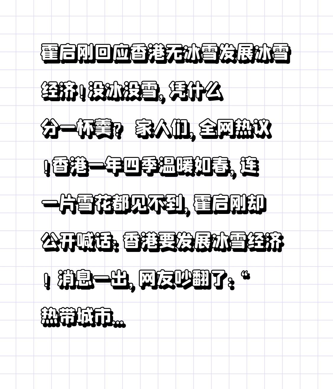 霍启刚回应香港无冰雪发展冰雪经济!没冰没雪,凭什么分一杯羹? 家人们,全网热议!香港一年四季温暖如春,连一片雪花都见不到,霍启刚却公开喊话:香港要发展冰雪经济! 消息一出,网友吵翻了:“热带城市搞冰雪?天方夜谭!”“没冰没雪,难道靠空调造雪?”“纯纯炒作,根本不切实际!” 确实,在大家的固有认知里,冰雪经济离不开东北的冰天雪地、哈尔滨的冰雪大世界,香港地处南方,全年无雪,连室内冰场都寥寥无几,谈何发展冰雪经济?很多人觉得,这就是一句不接地气的空话。 转折来了!霍启刚的回应,直接打破所有人的认知! 他直言,冰雪经济根本不是只有“滑雪、玩冰”这么简单,而是一条超长产业链!香港虽然没有天然冰雪,但有三大王牌优势,足以在全国冰雪产业里占据一席之地。 第一,科研优势。香港高校材料科学顶尖,而我国冰雪装备大多依赖进口,造雪机、滑雪板、冰刀鞋核心技术被国外垄断。香港可以联合哈尔滨等北方城市,专攻冰雪装备研发,实现国产替代,这是巨大的蓝海市场。 第二,管理优势。香港的ESG绿色管理、场馆运营、酒店服务全球领先,能把成熟的标准输出到北方冰雪景区,让冰雪旅游更环保、更规范、更高端。 第三,金融优势。作为国际金融中心,香港能为冰雪产业提供绿色信贷、融资支持,解决北方冰雪项目的资金难题,用金融赋能产业发展。 更关键的是,霍启刚提出“南北联动”:香港出技术、出资金、出管理,北方出场地、出资源、出市场,错位互补,不是竞争,而是共赢。现在香港年轻人已经开始“北上滑雪”,深港直达雪场的巴士、粤语滑雪课,早已打通了南北冰雪通道。 网友质疑的“没冰没雪”,在霍启刚眼里,根本不是短板,而是换赛道超车的机会。不跟北方比雪景,而是做产业链的“大脑”和“后盾”。 最后想说句心里话: 香港的智慧,北方的资源,合在一起就是中国冰雪经济的最强合力。这不仅是发展一个产业,更是南北携手、融入国家发展大局的生动体现。 没有条件,就创造条件;没有资源,就整合资源。这才是香港的底气,也是中国发展的底气。 别再用老眼光看新事物,冰雪经济的未来,从来不止在冰天雪地里!转发这条视频,看看香港如何用智慧玩转冰雪,为南北联动点赞!