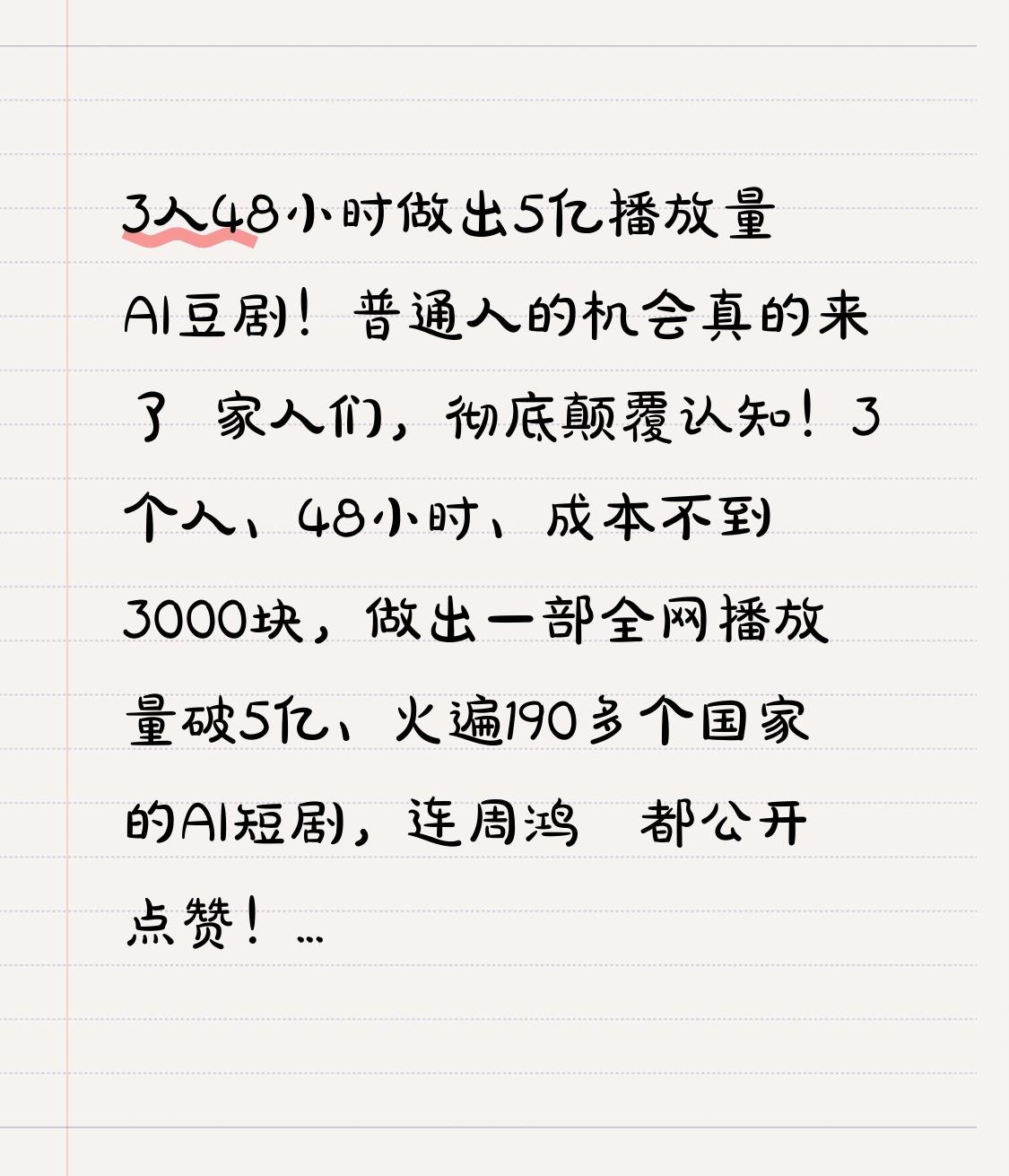 3人48小时做出5亿播放量AI豆剧!普通人的机会真的来了 家人们,彻底颠覆认知!3个人、48小时、成本不到3000块,做出一部全网播放量破5亿、火遍190多个国家的AI短剧,连周鸿祎都公开点赞!这不是神话,是正在发生的现实,看完你会发现,普通人的风口,真的来了! 这部爆火的AI短剧叫《霍去病》,没有明星、没有剧组、没有百万投资,主创团队只有3个人,导演杨涵涵甚至没有任何影视经验,之前只是普通上班族。他们用AI流水线,48小时纯工作时间,搞定80集内容,特效成本从传统每秒3000元,直接压到3元,降幅99.9%。 千军万马的战场、细腻的人物表情、电影级的画面质感,网友看完直呼“背脊发凉”,逼真到分不清是AI还是真人拍摄。上线一个多月,国内刷屏、海外爆火,海外播放占比高达78%,成了国产内容出海的新标杆。 转折来了! 很多人觉得:这是技术大佬的游戏,跟普通人没关系,我不懂技术、不会剪辑,根本做不了。 大错特错!这部剧的成功,根本不靠专业能力,靠的是选对赛道+AI工具+简单分工。3个人分工明确:1人写剧本、1人做制作、1人管音乐,全程用AI生成剧本、分镜、画面、配音,零基础也能快速上手。 以前拍短剧,几十人团队、几十万成本、几个月周期;现在3个人、几千块、两天就能出片,AI直接把影视行业的门槛砸到了地板上。 更扎心的是,这不是个例,AI短剧已经成了新的流量风口,无数普通人靠它逆袭。不用露脸、不用投资、不用场地,一台电脑就能创业,这是时代给普通人的红利。 最后想说: 每一次技术革命,都会淘汰一批观望的人,成就一批敢尝试的人。20年前的互联网、10年前的电商、5年前的短视频,都是如此。 AI不是来取代人的,是来帮普通人降低门槛、实现梦想的。别再抱怨没机会、没资源,机会就在眼前,敢迈出第一步,你就赢过90%的人。 转发给身边想创业、想搞副业的朋友,别错过这个普通人也能抓住的时代风口!