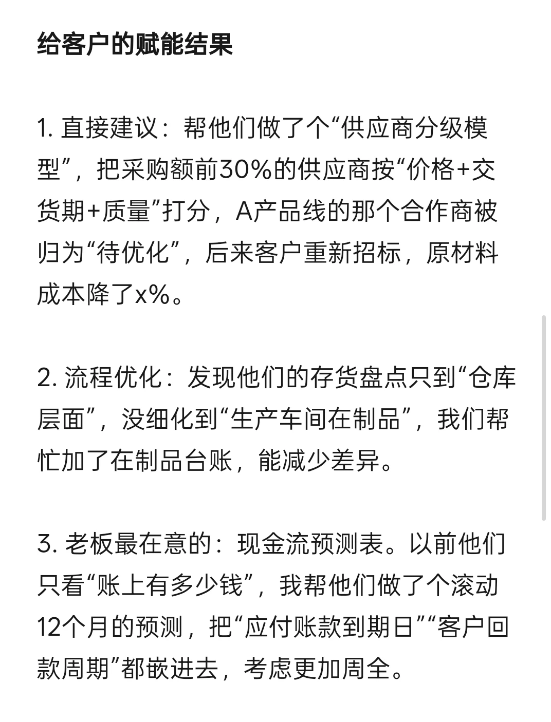1. 直接建议:帮他们做了个“供应商分级模型”,把采购额前30%的供应商按“价格+交货期+质量”打分,A产品线的那个合作商被归为“待优化”,后来客户重新招标,原材料成本降了x%。