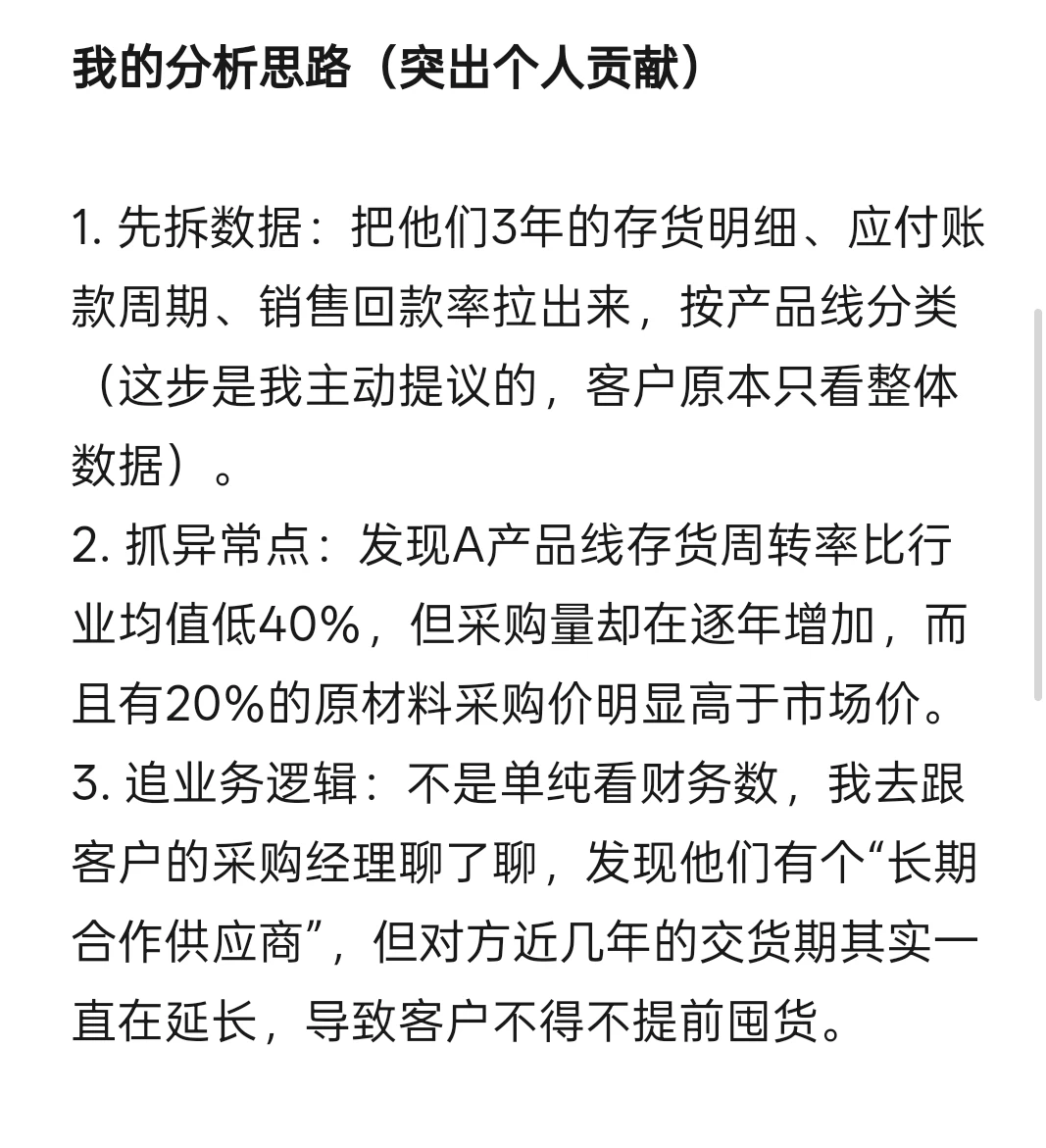 3. 追业务逻辑:不是单纯看财务数,我去跟客户的采购经理聊了聊,发现他们有个“长期合作供应商”,但对方近几年的交货期其实一直在延长,导致客户不得不提前囤货。