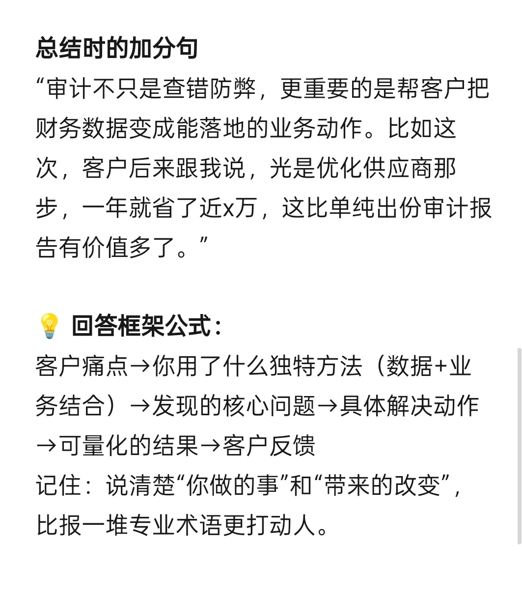 “审计不只是查错防弊,更重要的是帮客户把财务数据变成能落地的业务动作。比如这次,客户后来跟我说,光是优化供应商那步,一年就省了近x万,这比单纯出份审计报告有价值多了。”