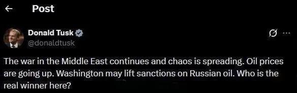 美国财政部长贝森特表示,美国正考虑暂时解除对俄罗斯石油出口的制裁,以弥补海湾危机造成的石油供应短缺。对此,波兰总理图斯克惊呆了、气疯了,忍不住吐槽“到底谁才是真正的赢家?” 图斯克啊,你还是年轻了,懂王不是一直在和普京眉来眼去吗,你难道看不见?
