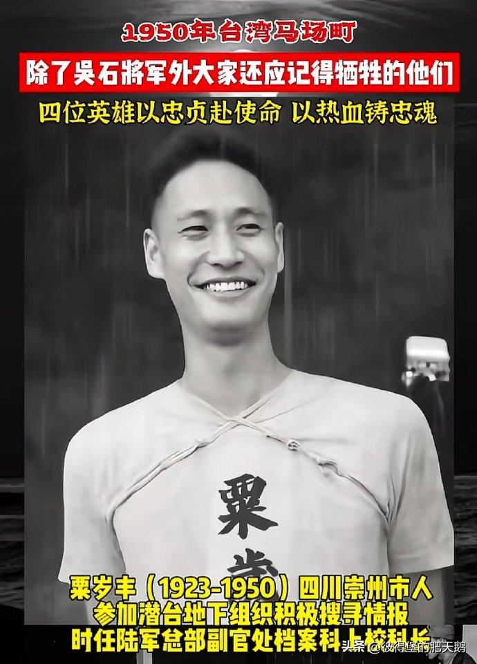 1950年台湾马场町,除了吴石將军外,大家还应记得牺牲的他们:四位英雄以忠贞赴使命,以热血铸忠魂! 1.毛鸿章(1911-1950),江西九江人,上海中国公学政经系毕业,台湾第十一绥靖区司令部经济处长; 2. 栗岁丰(1923-1950)四川崇州市人,参加潜台地下组织积极搜寻情报。时任陆军总部副官处档案科上校科长; 3. 陈道东(1924-1950), 四川武隆人,潜台地下党行动小组联络人。被捕前身份为军委会外事局翻译官; 4. 陆效文(1923-1950)江苏昆山人,中央政治大学外文系11期毕业,潜台地下党行动小组负责人。
