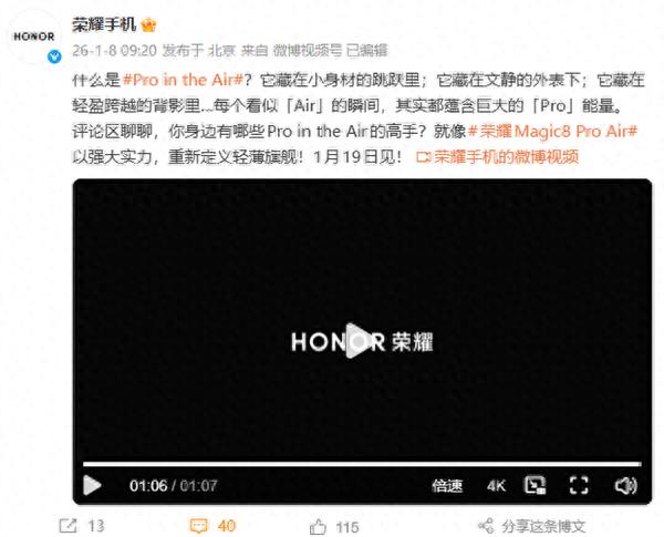 【TechWeb】去年10月,荣耀推出了全新的Magic8系列,全系标配了第五代骁龙8至尊版处理器,影像和续航等方面也进行了全方位升级,一经亮相便受到了用户的广泛关注。而在不久前,荣耀产品线总裁方飞透露,荣耀一款“既Pro又Air”的手机即将与大家见面。现在有最新消息,近日荣耀手机官微发布预热视频,正式官宣新机将命名为荣耀Magic8 Pro Air,将于1月19日亮相。