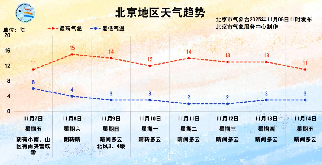 明天是立冬节气,北京市将迎来一次降水天气过程。明天早晨开始到夜间,降水将自西向东影响北京,山区有雨夹雪或雪,城区以降雨为主,影响城区的主要时段在中午前后至夜间,对交通出行(特别是周五晚高峰的交通)有一定不利影响,请提前做好防范准备。明天气温有所下降,体感阴冷,注意添衣保暖,谨防呼吸道和心脑血管疾病。