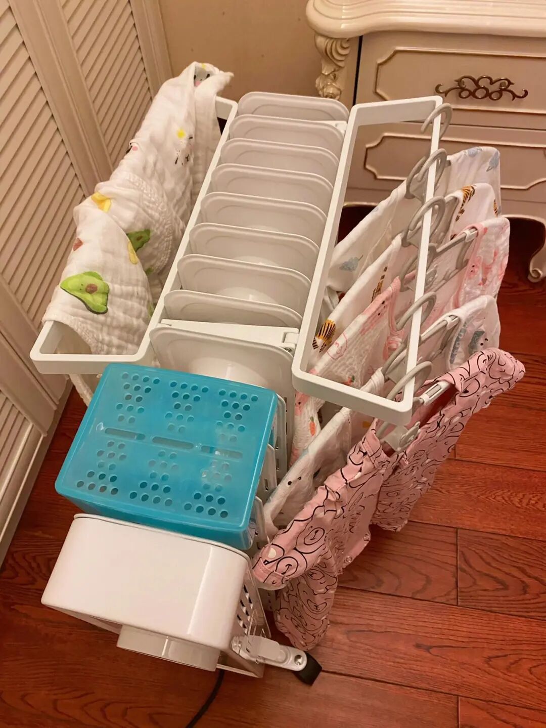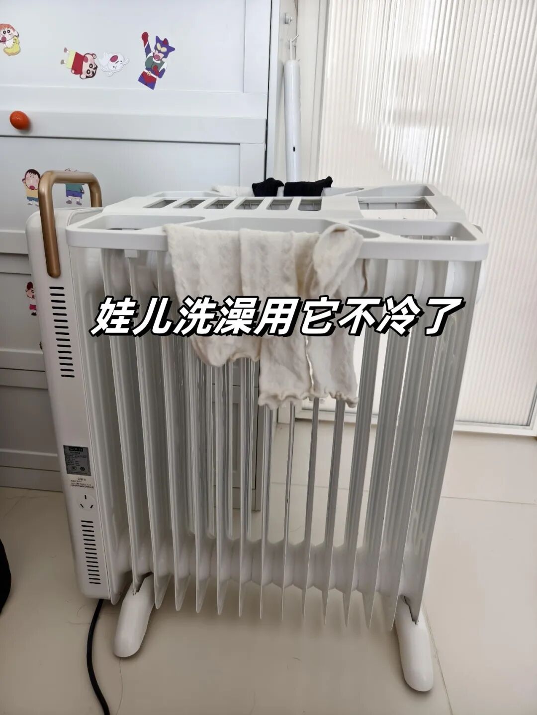 然后再洗澡就一点也不冷了,并且还可以把衣服放在油汀上面烘热,再给宝宝穿。