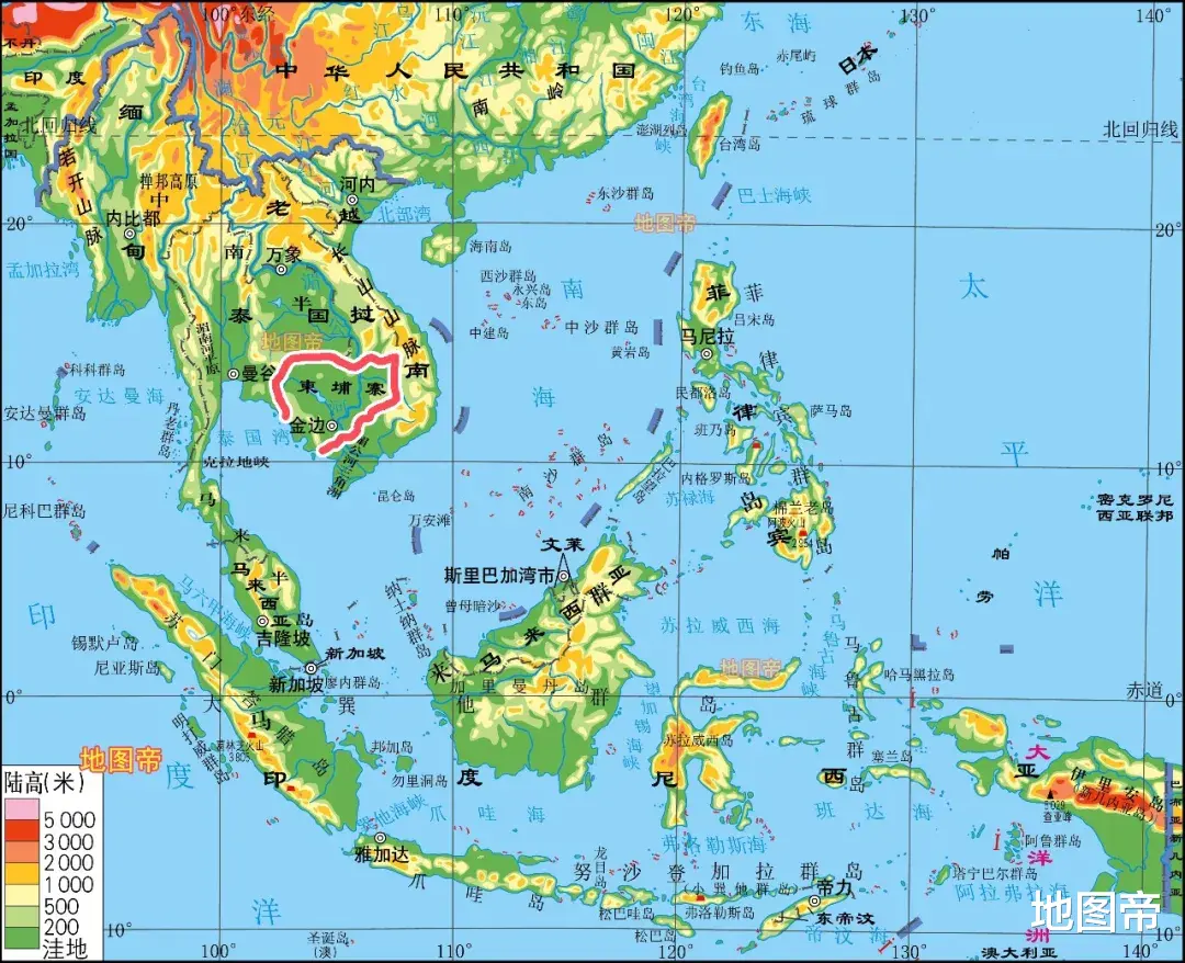 柬埔寨地形三面高,北有扁担山脉,东北有长山山脉,西南有豆蔻山脉,中部为广阔的湄公河冲积平原,湄公河自西北向东南穿过,洞里萨湖是东南亚最大的湖泊。