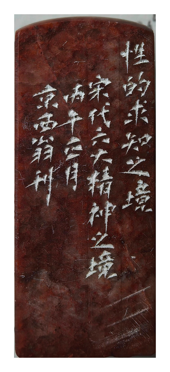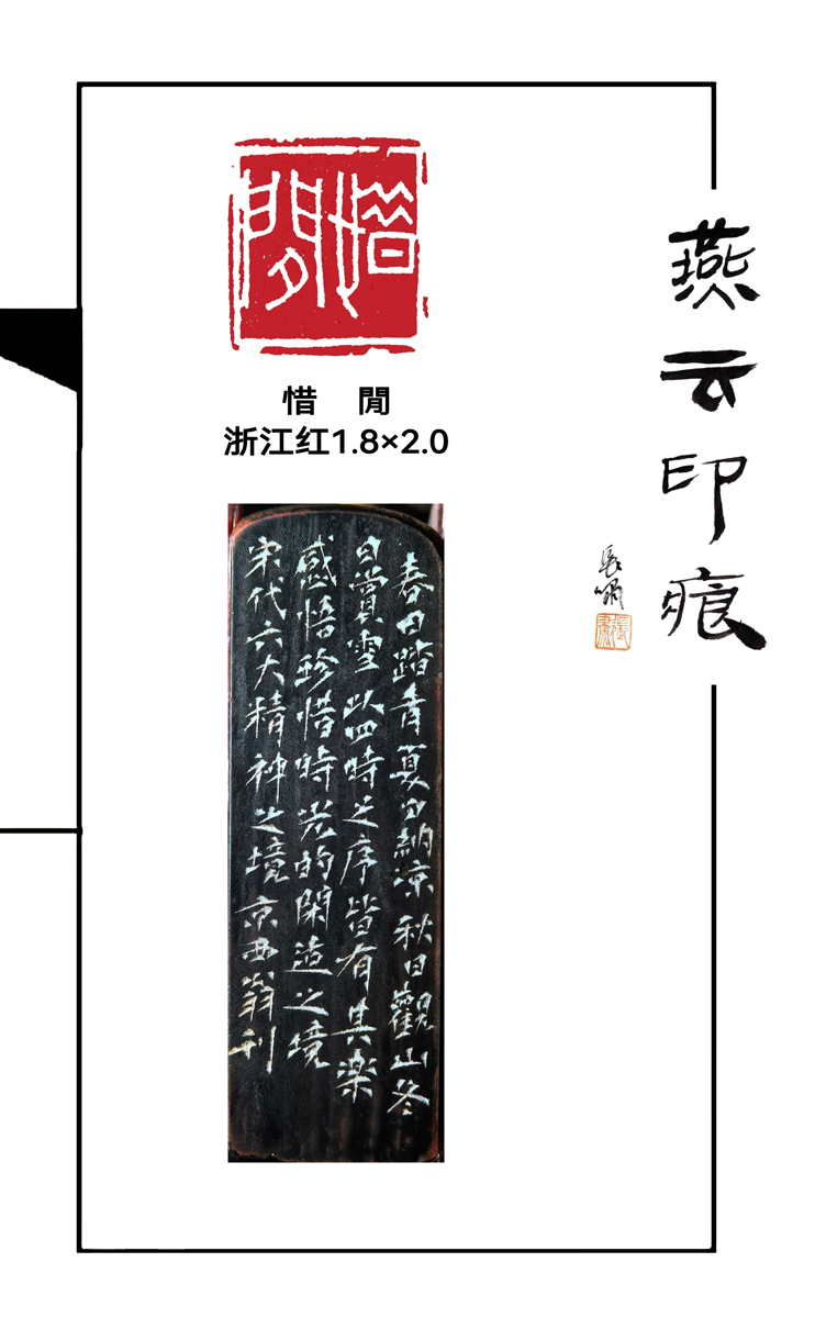 先生的刀,是历经千锤百炼的妙笔,藏着古法的底蕴,凝着宋人的雅致。执刀如执笔,运锋如运墨,冲刀似流云奔涌,劲挺洒脱,切刀若磐石立崖,沉稳厚重,披刀如微风拂柳,婉转灵动。刻藏雅,刀痕婉转如焚香点茶的清悠,朱印玲珑似插花挂画的含蓄;镌惜闲,线条疏朗如春日踏青的悠然,布局清雅似冬日赏雪的静谧。每一刀都有呼吸的节奏,每一划都藏宋韵的肌理,方寸印石,成了宋人生活的缩影,刀痕朱迹,皆是东方雅致的凝练。