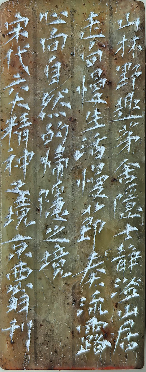 先生的石,是承载千年文脉的笺纸,朱白相生,虚实相映,尽彰篆刻之妙。他深谙篆刻 “计白当黑” 的真谛,刻出尘,以留白绘烟岚雾起,朱痕塑奇山异石,一刀一划间,尽现遁入山水的超脱;镌栖逸,以素石衬山林野趣,朱印凝茅舍隐士,方寸之间,流露心向自然的归隐。朱为形,白为境,朱白交错间,如宋人山水的留白写意,虚实相生处,似宋风诗意的婉转悠长,让一方方印石,有了山水的灵秀,有了心境的悠远。