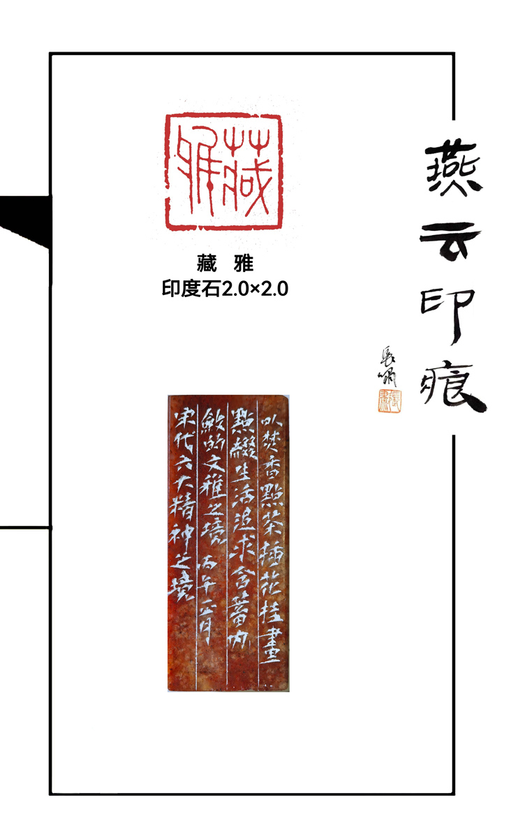 石不迷人人自迷,刀不醉人人自醉。一方青田凝古意,数刃寒锋刻宋魂。篆刻艺术家王燕云先生,以刀为笔,以石为纸,撷宋代六大精神境界为魂,融篆刻千年技法为骨,将藏雅、惜闲、出尘、栖逸、格物、审心的宋人意境,凝于方寸印石之间。刀起石落间,刻尽宋韵风华;朱痕漫染处,藏尽东方意趣,让一方方篆刻,成了宋人的诗,成了东方的韵,在金石方寸间,尽显篆刻艺术的隽永与灵秀。