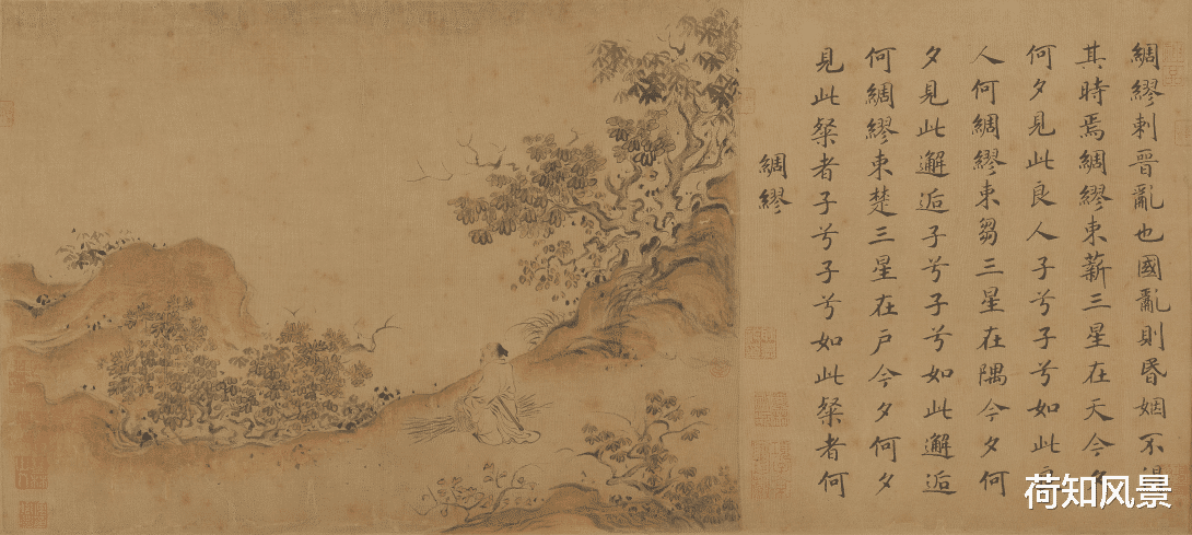 马和之的传世作品不多,但每一件都是精品。他的代表作《唐风图》卷是根据《诗经·国风》中的《唐风》十二篇诗意绘制而成,全卷分为十二段,每段描绘一篇诗意。这幅画以山水为背景,将人物活动融入其中,形成了生动的场景。画面的构图紧凑,色彩清新自然,细节处理到位,是马和之绘画艺术的杰出代表之一。