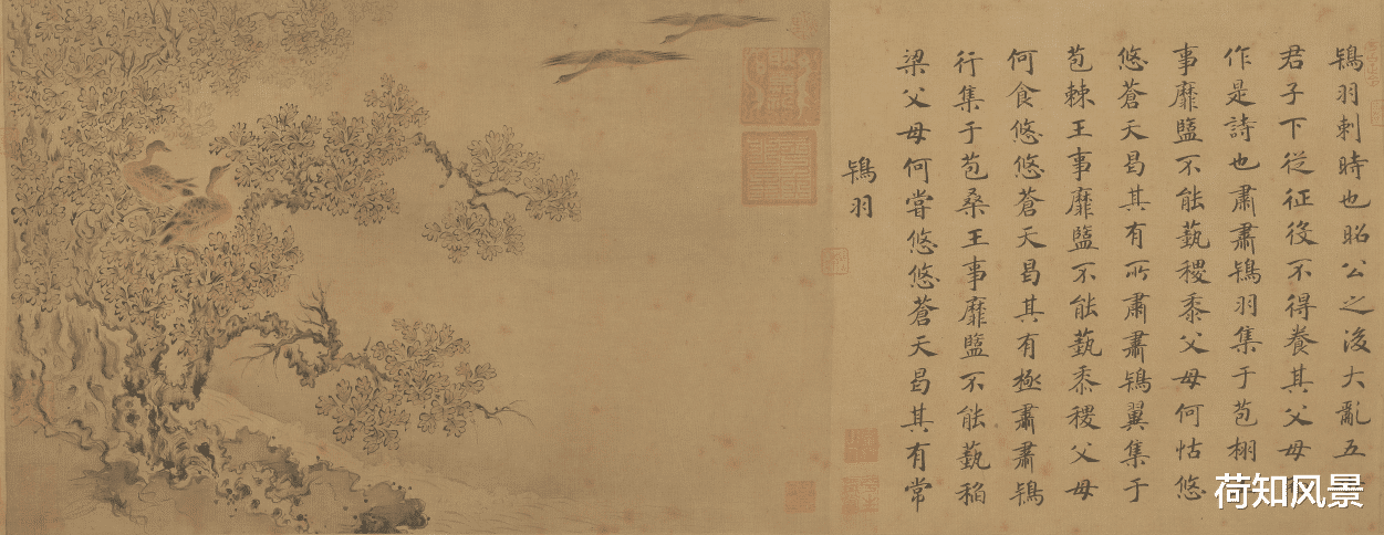 马和之在创作《唐风图》时,不仅注重画面的构图和细节处理,还将诗意与画境相结合,使得画面更具内涵和意境。这幅画以山水为背景,将人物活动融入其中,形成了生动的场景。同时,画家还通过细腻的笔触和生动的表情,将不同身份、不同性格的人物形象刻画得十分传神。这些特点都使得《唐风图》成为了宋代花鸟画的杰出代表之一。