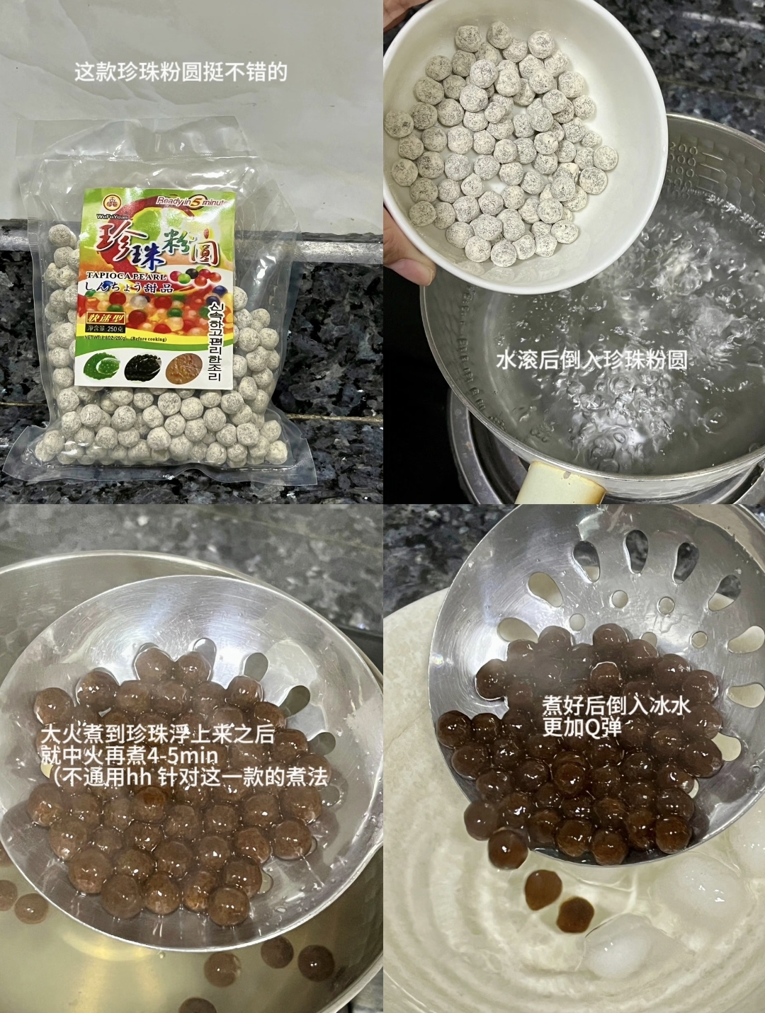 3. 最关键的一步来啦!煮好的珍珠立刻倒进冰水里“泡个澡”,这一步是让珍珠变得Q弹的秘密武器,试过的都知道有多绝!泡个2分钟左右,捞出来沥干水分,珍珠就做好啦,咬一口弹牙到飞起~