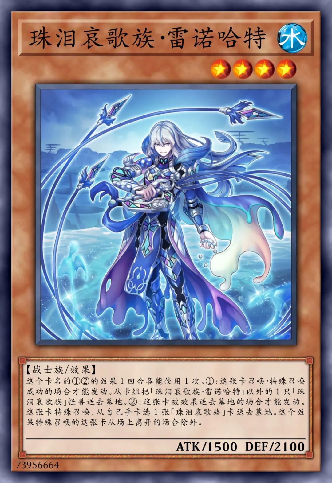 珠泪哀歌族•卡雷多哈特暗 9星ATK/3000 DEF/3000【恶魔族/融合/效果】「珠泪哀歌族•雷诺哈特」+水族怪兽× 2这张卡不能作为融合素材。这个卡名的①②效果在1回合内各可以使用1次。①:这张卡特殊召唤成功的场合或者这张卡在场上存在的状态有水族怪兽被效果送去我方墓地的场合,以对手场上1张卡为对象才可以发动。那张卡回到持有者卡组。②:这张卡被效果送去墓地的场合才可以发动。这张卡特殊召唤,从卡组将1张「珠泪哀歌族」卡送去墓地。
