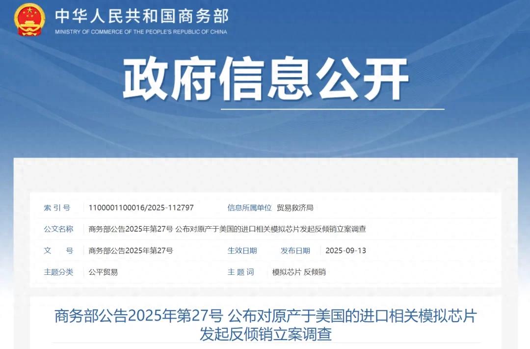 2025年9月13日,中国商务部宣布对美国进口的40nm及以上工艺通用接口芯片(如CAN收发器、RS485)和栅极驱动芯片(IGBT/MOSFET配套)发起反倾销调查。
