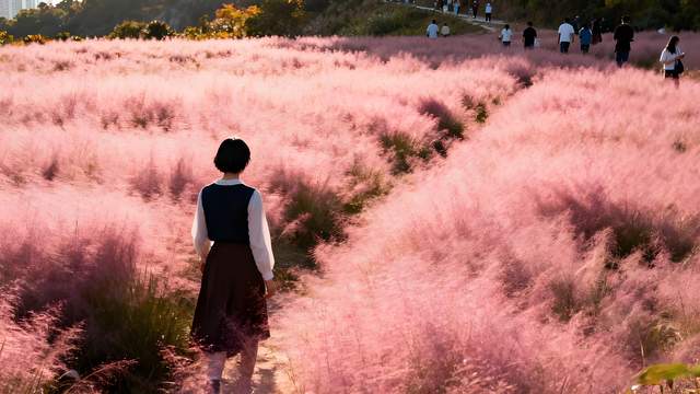 牛岗山公园的秋,是自然馈赠的粉色梦境。十月的山坡被粉黛乱子草尽数染成绯红,花穗随风摇曳时,整座山岗似流动的云霞。木栈道穿行于粉色花海中,游人漫步其间,衣袂轻拂花穗,仿佛踏入童话世界。夕阳西下时,余晖为粉黛镀上金边,与远处的城市天际线相映成趣,成为网红打卡的热门取景地。公园的另一侧,波斯菊与向日葵接力绽放,橙黄与粉红交织成绚烂的色块,孩童在花田边追逐嬉戏,笑声与秋风共谱欢快乐章。