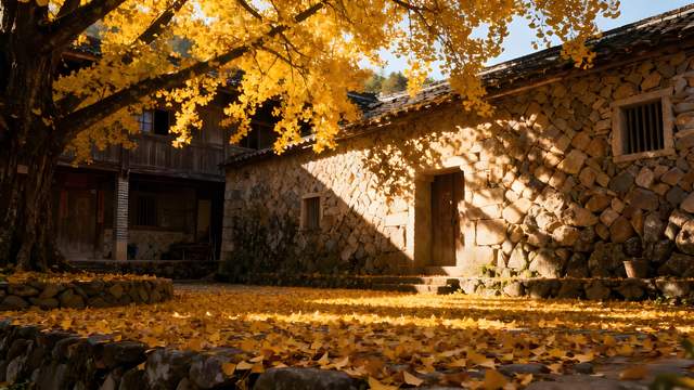 粉黛烟笼牛岗陌,银杏光摇石厝楼。