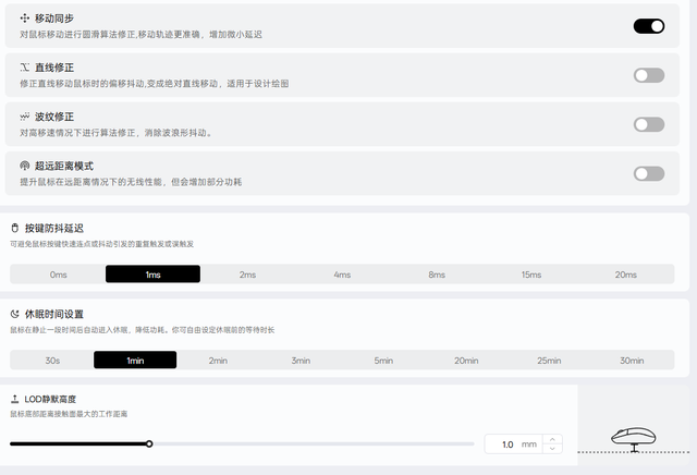 此外,11档LOD 高度调节(0.7mm-17mm)也解决了 “鼠标抬升后误触发” 的痛点,玩家可根据鼠标垫材质(布垫、树脂垫、金属垫)自定义传感器触发高度,避免游戏中因手部微抬导致的指针漂移。