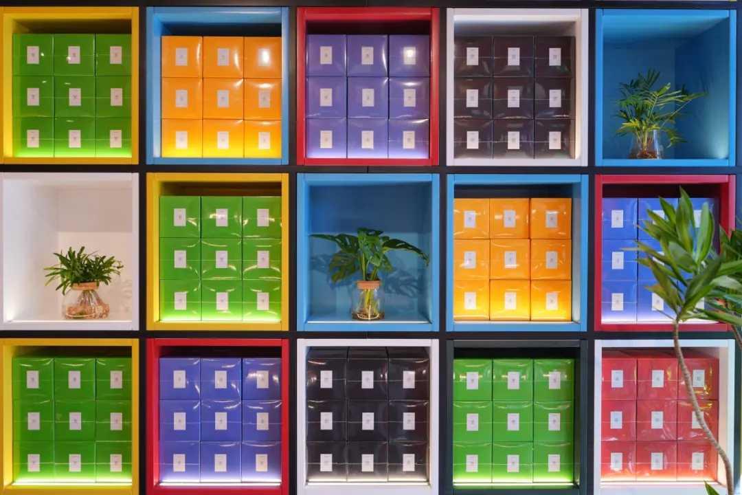 黄色 “大橘大利” 寓意招财,红色 “福聚奇楠” 寓意聚福,蓝色 “沉香佑安” 寓意平安,绿色 “紫运龙涎” 寓意开运。酒旅空间不用费脑子搞营销,只需要在客人离开时附一张手写卡:“愿‘大橘大利’伴你事事顺心”“愿‘沉香佑安’护你归途平安”……出片率不仅带来人流,还能带来销量。