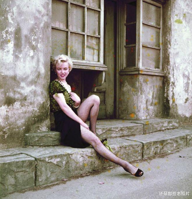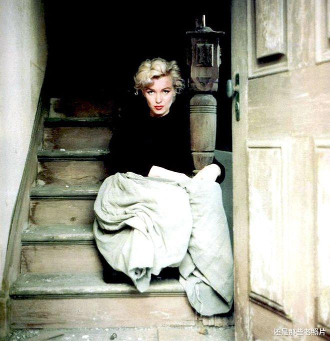50年代的美国,影星梦露静静地坐在楼梯上。这张照片由摄影师米尔顿·H·格林(Milton H. Greene)拍摄。