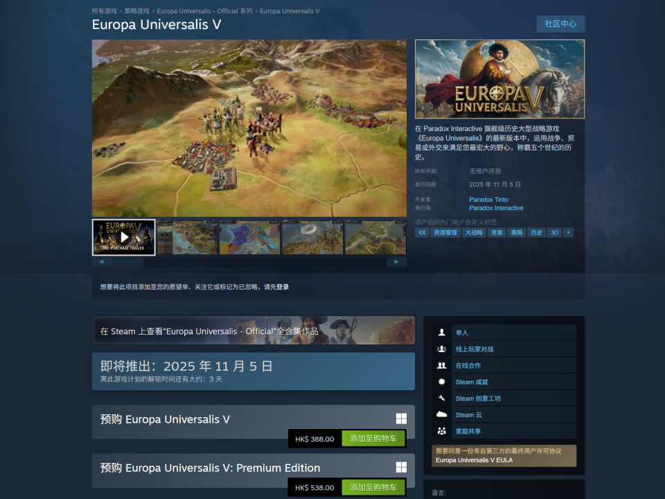 相信有很多玩家对欧洲大陆各个时代的故事很感兴趣,里面包含着多个时代很多个王朝,这在很多电影/电视剧里都能够看到故事线,看着看着就让人想要走进那个时间线里,用自己的策略来进行历练,寻找历史的答案!然而有这么一款游戏,正是能够让我们展开身手,能在游戏里完成欧陆历练,它就是《欧陆风云》!它是由Paradox Interactive开发的历史策略游戏系列,时间跨度从1444年至1821年,覆盖欧洲、美洲、非洲和亚洲超过250个国家的历史进程!从2000年开始的第一代,当时可选7个国家,但出道就是巅峰,当年就成为了年度最佳策略游戏候选!接着到2001年的二代、2007年的三代、2013年的四代,游戏是越做越精细,也培养了非常多的忠实玩家!然而最近来自这款游戏的第五代终于上线了,很多玩家纷纷表示终于等到你,可以展开手脚开始《欧陆风云5》的征途!