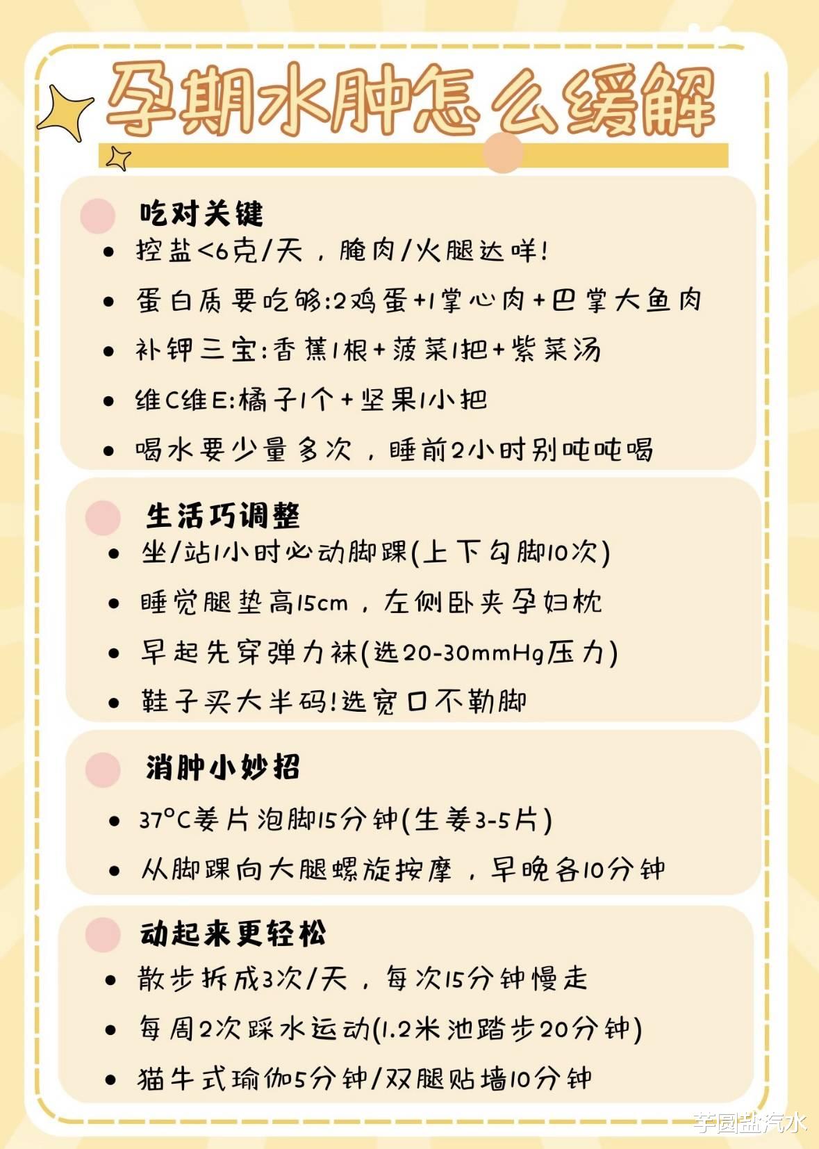 「左侧卧高垫脚,踝泵运动少不了;减盐加钾足量水,弹力袜里压力妙;面部突肿血压高,立刻就医别拖延!」把这张清单贴冰箱,每天打钩——**让水肿留在过去,把轻松还给孕期!**✨