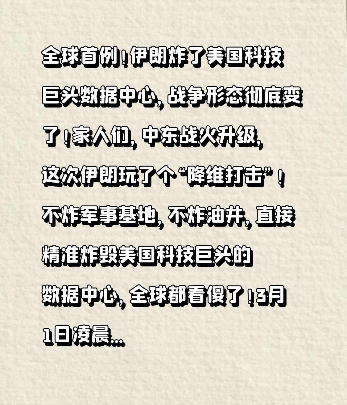 全球首例!伊朗炸了美国科技巨头数据中心,战争形态彻底变了! 家人们,中东战火升级,这次伊朗玩了个“降维打击”!不炸军事基地,不炸油井,直接精准炸毁美国科技巨头的数据中心,全球都看傻了! 3月1日凌晨,伊朗伊斯兰革命卫队出动自杀式无人机,8分钟精准突袭,直接命中亚马逊AWS在阿联酋的2座数据中心,巴林1座核心数据中心也被波及,引发火灾、断电、进水,硬件永久性损坏,服务至今离线。 这不是普通的军事冲突,是人类战争史上首次,把商业云数据中心当成军事目标打击!消息一出,全球震动,亚马逊股价暴跌,中东网银、企业APP全面瘫痪,连AI服务都跟着崩了。 很多人疑惑:放着军事基地不打,为啥盯着数据中心?转折来了!这里藏着伊朗最狠的算计! 这些看似“民用”的数据中心,根本不是普通机房,而是美以在中东的AI作战大脑!美军90%的军事AI运算、以色列的空袭指挥、情报监控,全靠亚马逊、微软的云算力支撑。 打掉数据中心,就等于废掉美以的“眼睛”和“耳朵”,再先进的战机、导弹,没了算力支持,全成废铁!伊朗用几架低成本无人机,瘫痪了美国几十亿的数字基础设施,效费比直接拉满。 更狠的是,伊朗