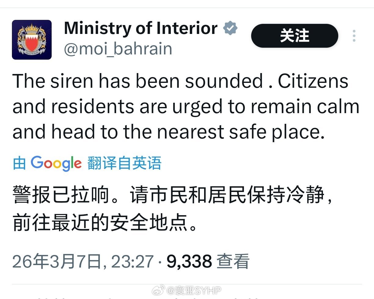 巴林内政部在X频道表示,空袭警报正在响起,并敦促居民保持冷静并前往附近安全地点。