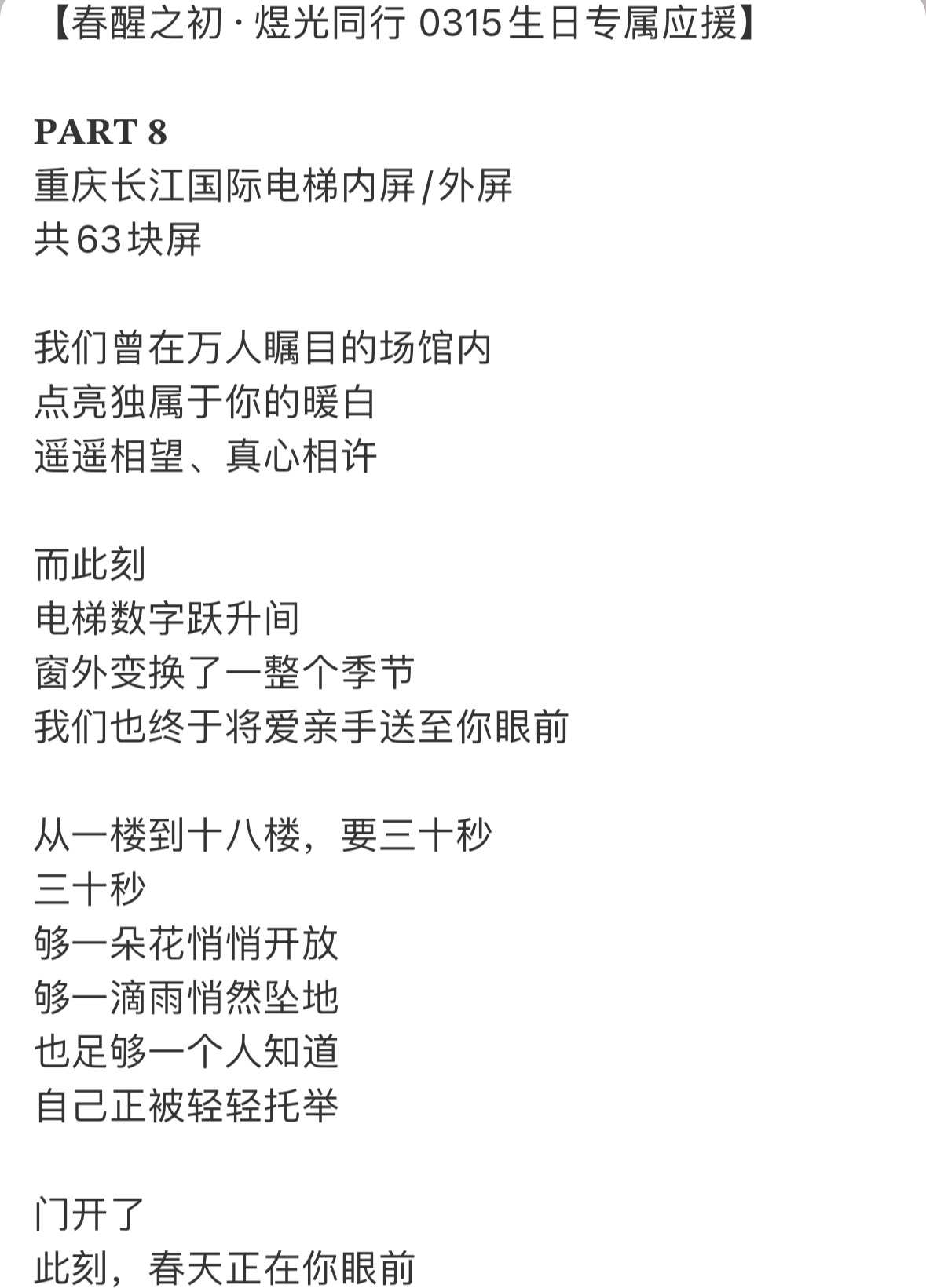 我觉得这个电梯内外屏应援真的特别有意义,东东来到时代峰峻的第一个生日被草草置办,营业照甚至都没有出外景,在电梯里随便拍了几张应付了事。但今年我们决不会让你再受这种委屈,外景大蛋糕你都应该得到。“门开了,春天正在你眼前”,电梯应援既是告别过去,也是迎接崭新的未来🥹
