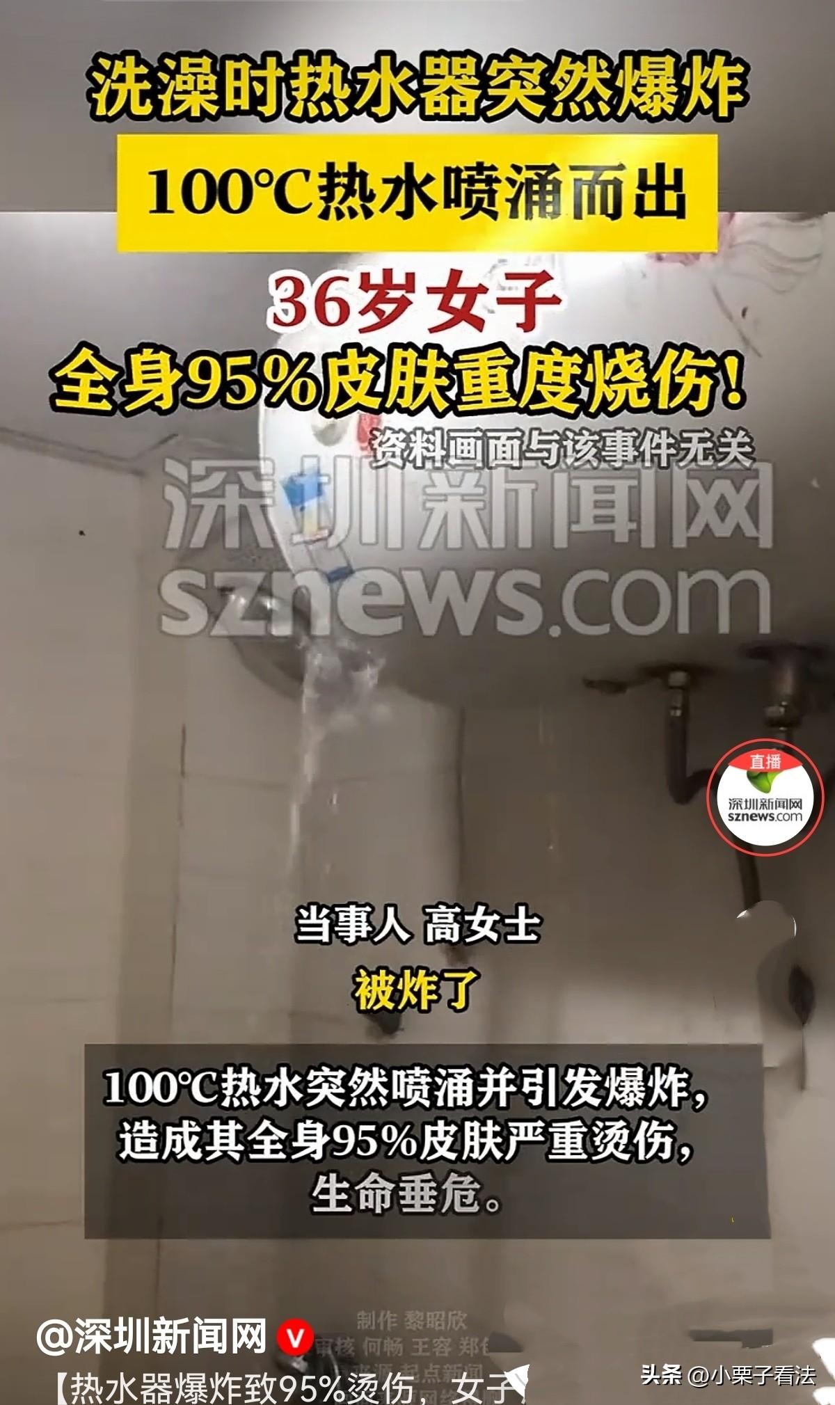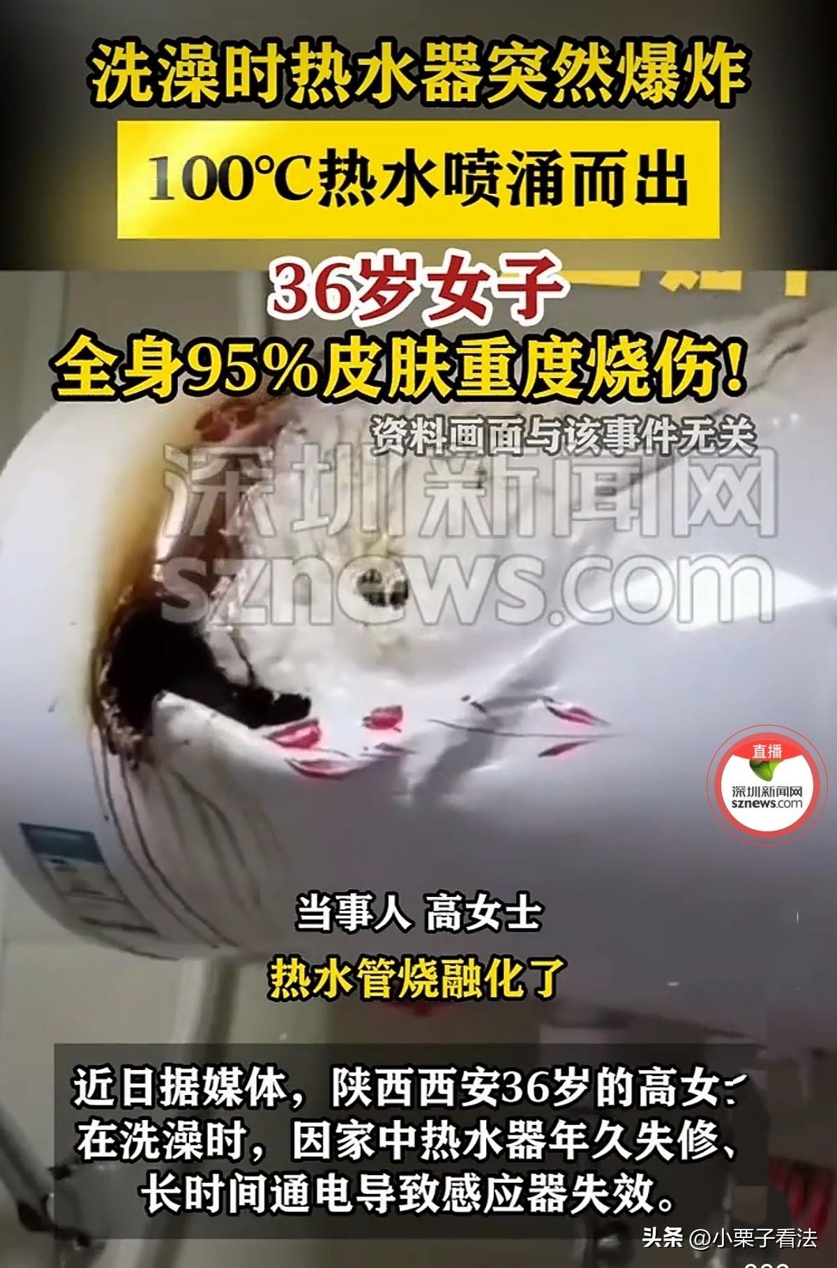 洗澡变炼狱!”陕西西安,36岁女子在浴室里,将水温调至合适的温度,哼着小曲享受着洗浴带来的快感,突然砰的一声巨响,热水器爆炸,水箱中的100℃的开水一泄而出,从上而下浇在她一丝不挂的身体上。她痛哭嘶吼,被儿子砸门救出送进医院。女子被诊断为严重烫伤,覆盖面积为95%,尽管医院多次下病危通知书,可在医生多次手术和女子的坚强求生欲支撑下,她闯祸了鬼门关,奇迹生还。目前恢复良好,已能自主进食。然而得知事故发生原因,全家人懊悔不已! 36岁的高女士一闭眼,脑海里还会反复出现浴室里那声震耳欲聋的爆炸,还有浑身被滚烫开水浇透的钻心剧痛。 那场发生在自家浴室里的意外,差点让她永远离开这个世界。 高女士与家人过着平淡又幸福的小日子。 那天忙完家里的琐事,她终于能抽空泡个热水澡放松一下。 走进浴室,她熟练地打开老热水器,把水温调到平时舒服的温度,哼着小曲,享受着洗去一身疲惫的轻松快感! 她怎么也想不到,这台陪伴了家人8年、从来没出过问题的热水器,早已成了埋在身边的定时炸弹。 就在她沉浸在热气弥漫的氛围里、全是放松,闭目哼曲,满是享受的时候,突然传来“砰”的一声巨响!热水器直接炸了! 原本应该温温的洗澡水,瞬间变成了滚烫到沸腾的100℃开水,毫无征兆地从上到下,狠狠兜头浇了下来。 由上而下一泄而出,直接浇在她一丝不挂的身上。 那一瞬间,高女士只觉得浑身像是被无数根烧红的针狠狠扎着,又像是整个人被扔进了滚油里,皮肤瞬间就失去了知觉,紧接着就是撕心裂肺的疼。 她顾不得想到底发生了什么,下意识地呼救嘶喊。尖叫声由浴室传出。 她想逃离这灾难的地方,可浑身剧痛让她乱蹦,手脚胡乱挥舞。 浴室的门被反锁着,外面的儿子听到妈妈撕心裂肺的哭喊和巨响,吓得魂都飞了,一边大喊“妈妈”,一边拼命砸门、踹门。 几分钟像一个世纪那么漫长,儿子终于破门而入,眼前的一幕让他当场吓傻:妈妈浑身通红,皮肤大面积烫伤,蜷缩在地上痛苦呻吟。 孩子顾不上害怕,赶紧喊来家人,第一时间把高女士送往医院。 送到医院时,高女士已经奄奄一息。检查结果让所有医生都倒吸一口凉气:全身95%皮肤重度烫伤,伤势重到超乎想象。 在后续治疗里,医院接连下了好几次病危通知书,每一张通知书,都像一块巨石压在全家人心上。 高女士躺在病床上,意识模糊时只觉得浑身火烧火燎,清醒时又被绝望包裹,好几次都觉得自己撑不下去了。 可一想到门外焦急守候的孩子和家人,她又咬牙逼着自己活下去,凭着一股不服输的求生欲,死死扛着。 医生们也没有放弃,集结多个科室专家联手救治,一台接一台的手术,日夜不停的监护护理,一点点帮她清理创面、对抗感染、修复皮肤。 感染关是烧伤患者最难迈的坎,多少人都没能挺过去,可高女士做到了。 她在医生的全力救治和自己的顽强坚持下,硬生生从鬼门关闯了回来。 等到病情渐渐稳定,高女士和家人想弄明白这场灾难的根源,再找肇事责任方讨要说法。 谁知,他们找人这么一查,原来是这台热水器用了整整8年,早就超过了安全使用年限。 长期通电使用,加上热水管老化融化,直接导致温控感应器彻底失灵,原本设定的温水直接烧到了100℃,最终引发管道爆裂和爆炸。 明明只要提前检查、及时更换老旧电器,就能避免这场灭顶之灾。 可就是因为一时的疏忽,让一场平常的洗澡,变成了九死一生的劫难。 得知是这种情况,全家人悔得肠子都青了,这找热水器厂方肯定不在理,自己不注重细节,疏忽大意才造成事故发生,怨不得别人! 幸运是,如今高女士已脱离生命危险,恢复情况越来越好,不仅能自主活动,还可以正常吃饭、自理生活。 回想起这场噩梦,她依旧心有余悸,更多的是对家人的愧疚和对安全用电用气的后怕。 对此您怎么看?