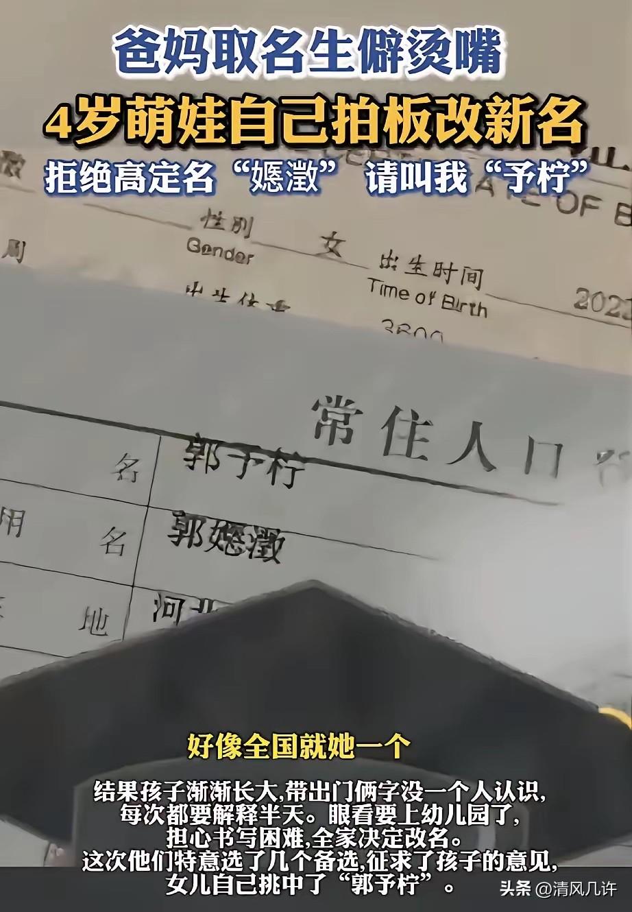 河北张家口,一4岁女孩,因为父母给她取的名“郭嫕澂”生僻又烫嘴,常常被别人叫不出她的名字,于是女孩自己拿主意改名为“郭予柠”,而引起了网友们的一片热议。 女孩的妈妈张女士和丈夫,当初为女儿取名时,翻遍了字典和古籍,一心想给孩子取个既有美好寓意又能避免重名的名字。 “嫕”字寓意性情和善、温柔乖巧,“澂”同“澄”,代表内心清澈纯净,组合起来寄托着他们希望女儿性情温婉、内心澄澈的美好期许。夫妻俩特意查询了姓名登记系统,发现“郭嫕澂”这个名字在全国范围内几乎独一无二,当时还为此十分得意,觉得给了孩子一份专属的“人生礼物”。 这份得意,却在孩子慢慢长大的过程里,变成了实实在在的困扰。 孩子刚满3岁时,张女士带她去社区办理儿童保健手册,工作人员盯着登记表上的名字看了许久,最终还是抬头询问这两个字的读音和写法。孩子站在旁边,看着大人们反复确认,小脸上露出了茫然的神情。从那之后,这样的场景频繁出现。 快递员上门送件,念不出名字只能喊“郭姓小朋友的快递”;小区里的邻居遇见,会笑着问孩子的名字,张女士解释完读音和含义,对方也只是摇摇头,说记不住。甚至有亲戚把“嫕澂”误读成“媳妇”,孩子每次都要委屈地纠正,久而久之变得不爱介绍自己。 眼看孩子即将上幼儿园,书写的难题也摆在了眼前。“嫕”和“澂”两个字笔画繁杂,对4岁的小朋友来说,写起来又累又难。 有一次,张女士教孩子写自己的名字,孩子握着铅笔,歪歪扭扭地画了半天,急得眼眶发红,把笔一扔说:“我不写了,太难了!”那一刻,张女士和丈夫才真正意识到,自己追求的独特,给孩子带来了心理和实际的双重压力。他们开始反思,名字的本质是陪伴孩子一生的符号,若这个符号让孩子陷入尴尬和自卑,再独特的寓意也失去了意义。 他们咨询了当地派出所的户籍窗口,工作人员明确告知,未成年人因姓名生僻导致日常学习、生活不便的,监护人可以提交书面申请办理改名,这属于法定的合理更名理由。 确定可以改名后,夫妻俩没有再自作主张,而是第一次把选择权交到了4岁的女儿手里。他们精心挑选了“郭予柠”“郭沐希”“郭安诺”三个简单好听、笔画少、寓意好的名字,写在白纸上,摊在客厅的桌子上。 孩子歪着小脑袋,一个个跟着父母念,念到“予柠”两个字时,她停了下来,反复念了好几遍。 张女士轻声问她是不是喜欢这个名字,孩子用力点了点头,小手拍着桌子,认真地说:“就叫郭予柠,这是我的新名字,写起来也快!”童言无忌,却让夫妻俩又好笑又心酸。他们知道,孩子的选择,藏着对轻松自在的渴望。 办理更名手续的那天,孩子跟着父母一起到了派出所。户籍民警核对材料时,笑着和孩子确认是不是真的确定要改成这个名字。 孩子挺起小胸脯,大声回答“确定”,那份雀跃的模样,是夫妻俩很久没在她脸上见到的。常住人口登记表上,“郭嫕澂”被清晰地填在了曾用名一栏,“郭予柠”则成为了她的正式姓名,这份来自河北张家口的户籍记录,见证了这个4岁女孩的一次重要选择。 改名之后,孩子的变化肉眼可见。幼儿园正式报名那天,老师一眼就叫对了“郭予柠”,孩子立刻笑着回应,还主动走到老师面前,介绍自己的年龄和爱好。 小区里的邻居再喊她的名字,她会大方地答应,偶尔有人念错,她还会奶声奶气地纠正。张女士说,现在孩子每次听到别人叫“予柠”,都会开心地回应,性格也变得更开朗了。 这件事引发的讨论,早已超出了名字本身。户籍部门的相关数据显示,近年来因姓名生僻字申请更名的未成年人数量持续增长,困扰孩子们的不仅是认读困难,还有书写不便,甚至在入学报名、医保结算、乘坐高铁时,会因为系统无法识别生僻字,出现登记失败的情况。 而张女士夫妇的做法,也让很多家长开始反思:给孩子取名,真的别光顾着自己觉得过瘾,或是追求所谓的“独特”,好读、好写、好用,才是对孩子最实在的呵护。 张女士在接受采访时,言语里满是愧疚。 她说当初只想着给孩子一个独一无二的名字,却忽略了孩子的实际感受,也没考虑到生僻字在日常生活中的使用难题。这次改名对他们而言,是一次深刻的育儿反思。 为人父母,总习惯用自己的认知和喜好为孩子做决定,却常常忽略,孩子才是名字的使用者,也是人生的主角。名字的美好,从来不是藏在生僻的笔画里,而是藏在被人顺畅呼唤时的温暖里,藏在孩子听见名字时的自信里。 各位读者你们怎么看?欢迎在评论区讨论。