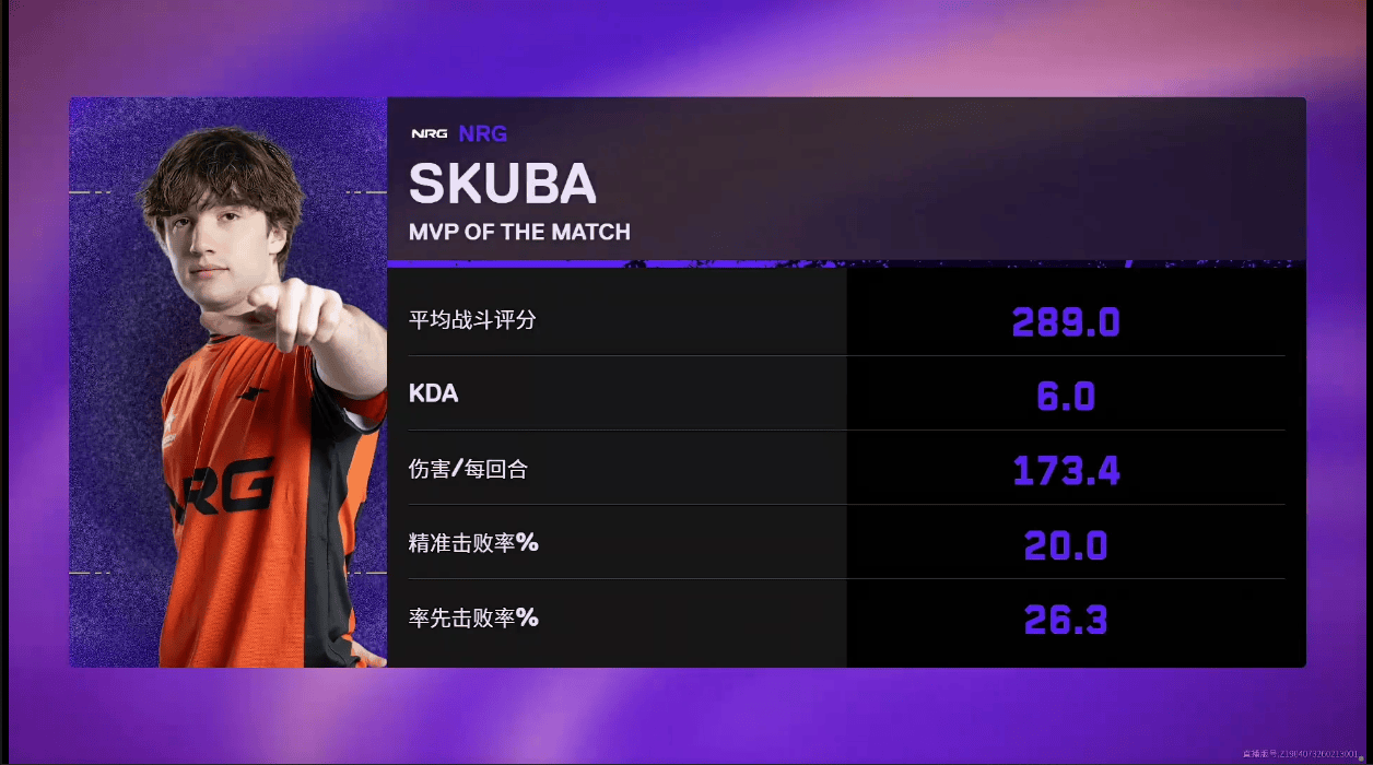 虎扑03月08日讯在刚刚结束的NRG对阵BBL的BO3比赛中,289战斗评分6.0KDA,skuba斩获NRG对阵BBL图一MVP