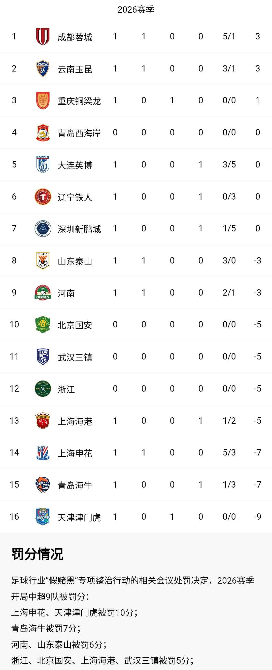为了清零,2026中超首轮积分榜太魔幻!中超积分榜也算是一道奇葩风景,这剧情,足坛罕见! 泰山、申花双双赢球仍是负分,一个直升至第8,一个脱离降级区升至第14。 赢球不涨正分、拿分先填坑,本赛季中超保级与争冠全看“还债速度”。 是时候重新洗牌了,中超争冠格局生变,黑马球队强势崛起。