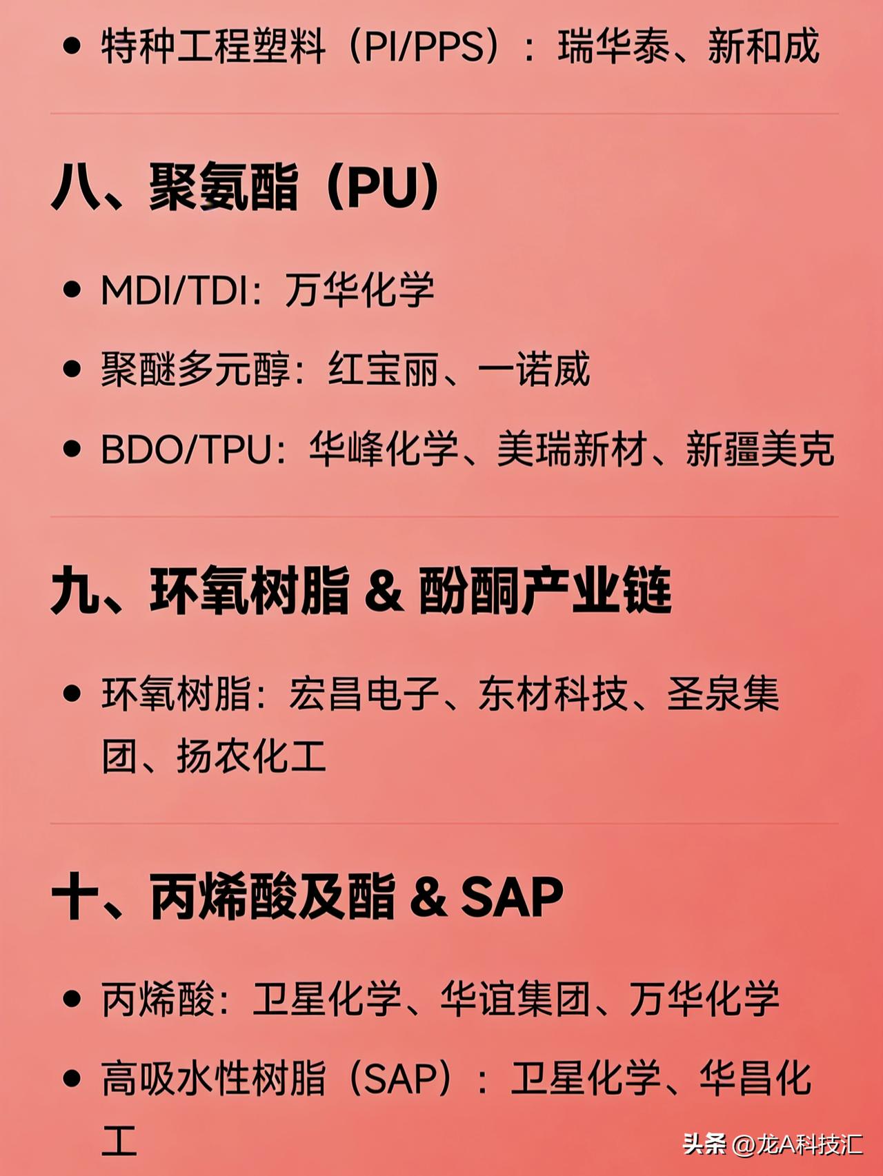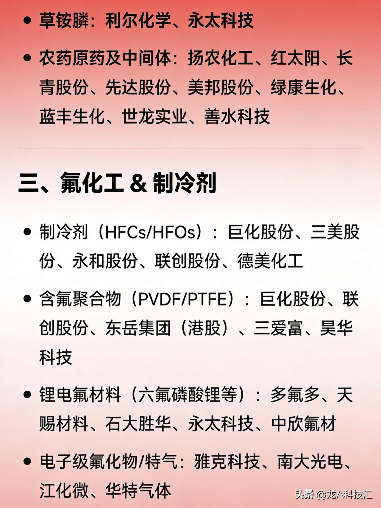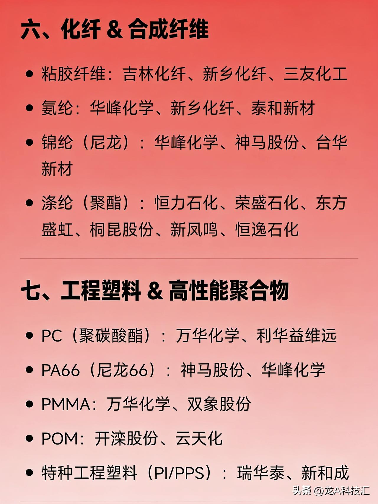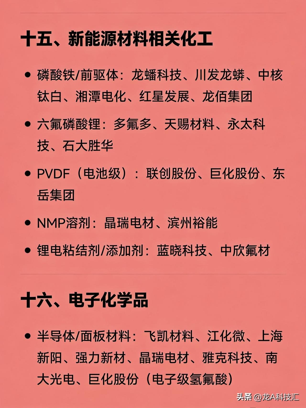 最新、最全面的化工概念企业全梳理 一、基础无机化工 氯碱(烧碱/PVC):新疆天业、中泰化学、氯碱化工、英力特、三友化工、金牛化工 纯碱:山东海化、远兴能源、双环科技、和邦生物、苏盐井神、雪天盐业 工业盐/盐化工:苏盐井神、雪天盐业、吉兰泰(中盐化工) 硫酸/硫化工:鲁北化工、云图控股、川能动力、龙佰集团 二、化肥与农化 氮肥(尿素/合成氨):华鲁恒升、湖北宜化、泸天化、阳煤化工、云天化、远兴能源、兰花科创 磷肥/磷化工:云天化、兴发集团、川发龙蟒、川恒股份、新洋丰、芭田股份、六国化工、司尔特、安纳达、川金诺、清水源 钾肥:盐湖股份、藏格矿业、亚钾国际、东方铁塔、西藏矿业 复合肥:史丹利、金正大、新洋丰、芭田股份、六国化工 草甘膦:兴发集团、和邦生物、新安股份、江山股份、广信股份 草铵膦:利尔化学、永太科技 农药原药及中间体:扬农化工、红太阳、长青股份、先达股份、美邦股份、绿康生化、蓝丰生化、世龙实业、善水科技 三、氟化工 & 制冷剂 制冷剂(HFCs/HFOs):巨化股份、三美股份、永和股份、联创股份、德美化工 含氟聚合物(PVDF/PTFE):巨化股份、联创股份、东岳集团(港股)、三爱富、昊华科技 锂电氟材料(六氟磷酸锂等):多氟多、天赐材料、石大胜华、永太科技、中欣氟材 电子级氟化物/特气:雅克科技、南大光电、江化微、华特气体 四、钛白粉 & 钒钛化工 钛白粉:龙佰集团、中核钛白、安纳达、金浦钛业、惠云钛业、鲁北化工 钛精矿:安宁股份 钒产品:钒钛股份 五、染料 & 颜料 染料:浙江龙盛、闰土股份、吉华集团、安诺其 有机颜料:七彩化学、双乐股份、百合花、福莱蒽特、锦鸡股份 六、化纤 & 合成纤维 粘胶纤维:吉林化纤、新乡化纤、三友化工 氨纶:华峰化学、新乡化纤、泰和新材 锦纶(尼龙):华峰化学、神马股份、台华新材 涤纶(聚酯):恒力石化、荣盛石化、东方盛虹、桐昆股份、新凤鸣、恒逸石化 七、工程塑料 & 高性能聚合物 PC(聚碳酸酯):万华化学、利华益维远 PA66(尼龙66):神马股份、华峰化学 PMMA:万华化学、双象股份 POM:开滦股份、云天化 特种工程塑料(PI/PPS):瑞华泰、新和成 八、聚氨酯(PU) MDI/TDI:万华化学 聚醚多元醇:红宝丽、一诺威 BDO/TPU:华峰化学、美瑞新材、新疆美克 九、环氧树脂 & 酚酮产业链 环氧树脂:宏昌电子、东材科技、圣泉集团、扬农化工 十、丙烯酸及酯 & SAP 丙烯酸:卫星化学、华谊集团、万华化学 高吸水性树脂(SAP):卫星化学、华昌化工 十一、煤化工 & C1化工 煤制烯烃/甲醇:宝丰能源、华鲁恒升、鲁西化工、远兴能源、中煤能源、兖矿能源 十二、炼化一体化 & 轻烃利用 大型炼化:恒力石化、荣盛石化、东方盛虹、中国石化 轻烃裂解(PDH/乙烷):卫星化学、东华能源、金能科技 十三、硅基材料 工业硅/有机硅:合盛硅业、新安股份、东岳硅材、晨光新材、三友化工 十四、精细化工 & 专用化学品 食品添加剂:金禾实业、保龄宝、华康股份 香精香料:新和成、爱普股份 表面活性剂:赞宇科技、皇马科技、科隆股份 橡胶助剂:阳谷华泰、彤程新材、濮阳惠成 抗老化剂:利安隆 工业杀菌剂:百傲化学 医药中间体:联化科技、博瑞医药、同和药业、奥锐特、本立科技 十五、新能源材料相关化工 磷酸铁/前驱体:龙蟠科技、川发龙蟒、中核钛白、湘潭电化、红星发展、龙佰集团 六氟磷酸锂:多氟多、天赐材料、永太科技、石大胜华 PVDF(电池级):联创股份、巨化股份、东岳集团 NMP溶剂:晶瑞电材、滨州裕能 锂电粘结剂/添加剂:蓝晓科技、中欣氟材 十六、电子化学品 半导体/面板材料:飞凯材料、江化微、上海新阳、强力新材、晶瑞电材、雅克科技、南大光电、巨化股份(电子级氢氟酸) 十七、工业气体 & 特种气体 工业气体:杭氧股份、侨源股份 电子特气:华特气体、金宏气体、凯美特气、雅克科技、南大光电、和远气体 十八、环保与循环化工 危废处理:东江环保、高能环境、雪浪环境 再生材料:万凯新材(rPET)、英科再生